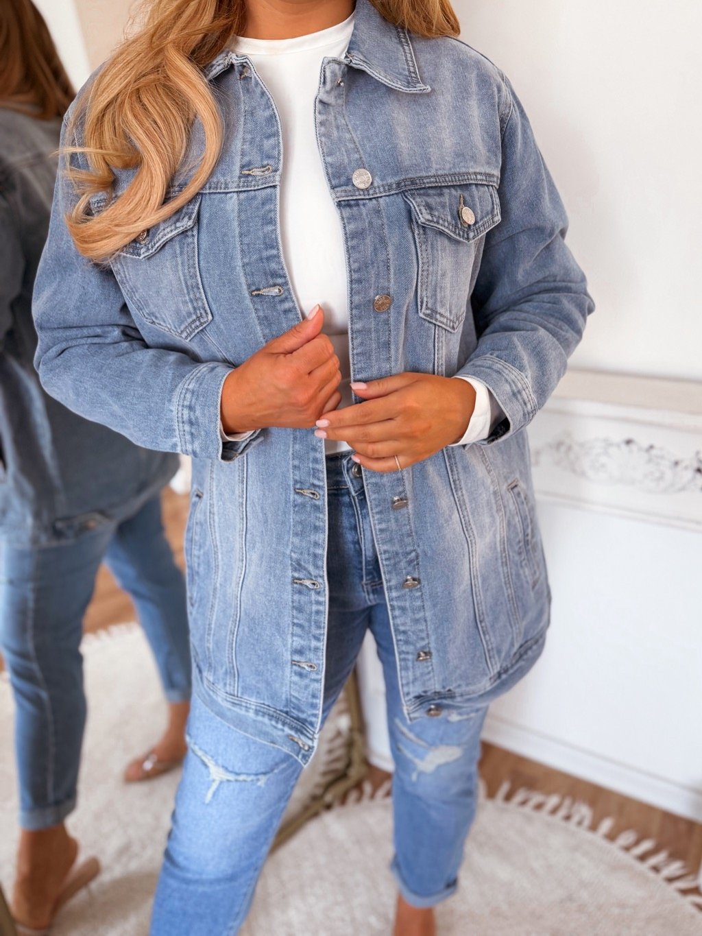 Krátka riflová bunda je mierne elastická. Modelka meria 168 cm a má na sebe veľkosť 42.