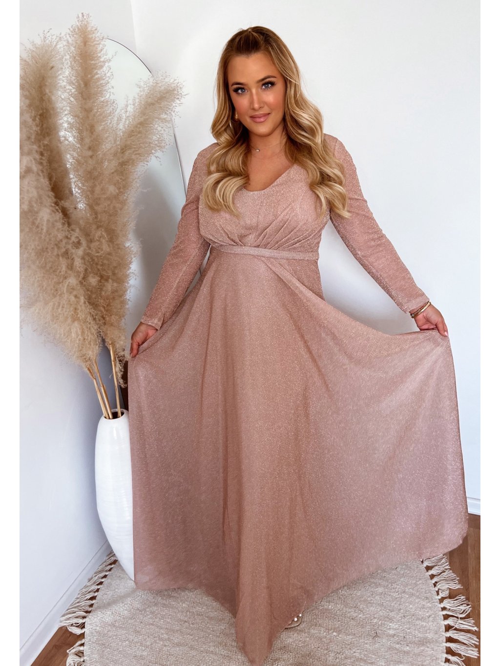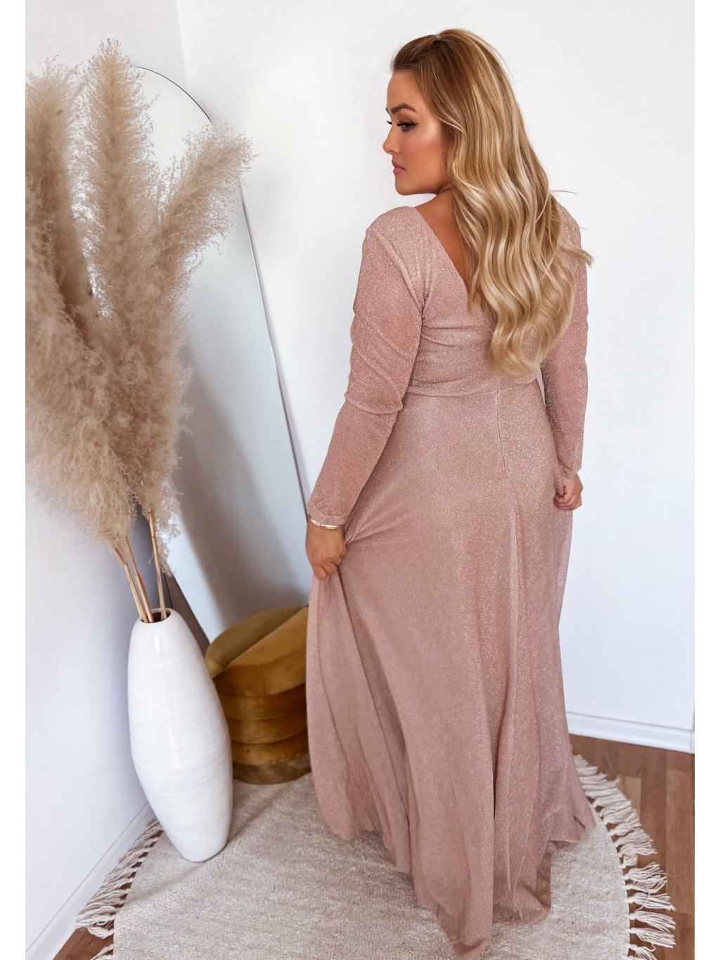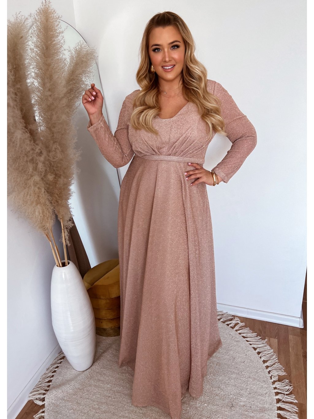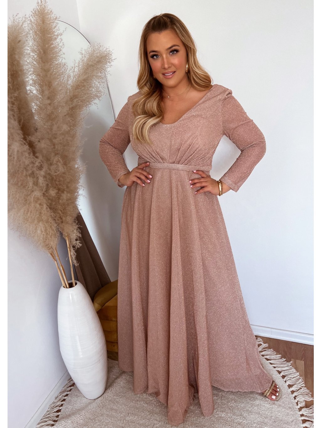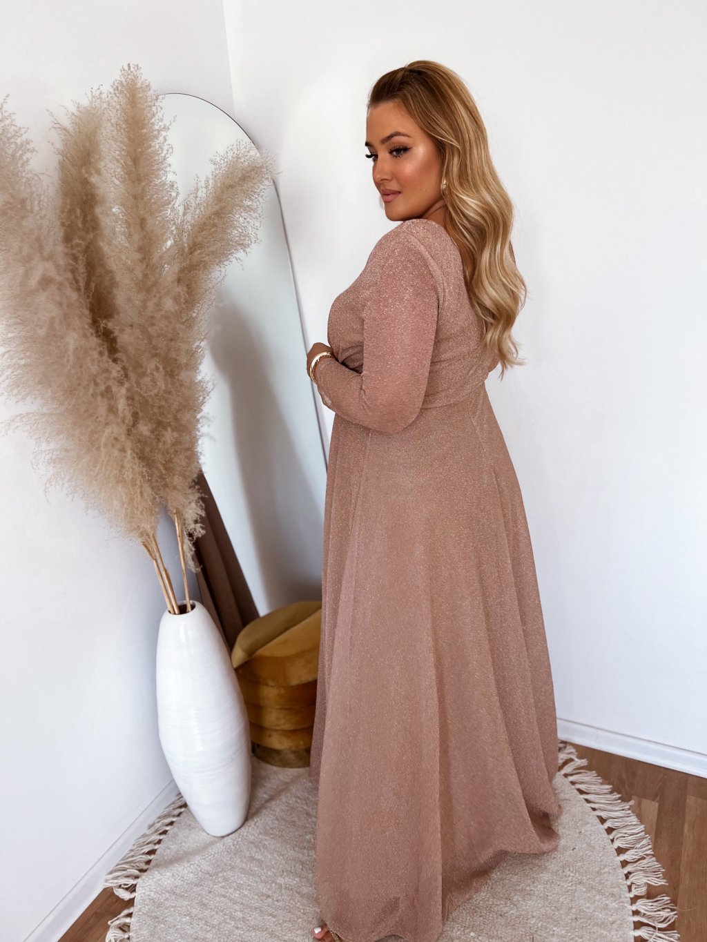 Dlhé spoločenské šaty s dlhým rukávom, bohatou sukňou. Šaty sú mierne elastické, sukňa má úplne voľný strih. Na zadnej strane je zapínanie na zips. Modelka meria 168 cm a má na sebe veľkosť XL.