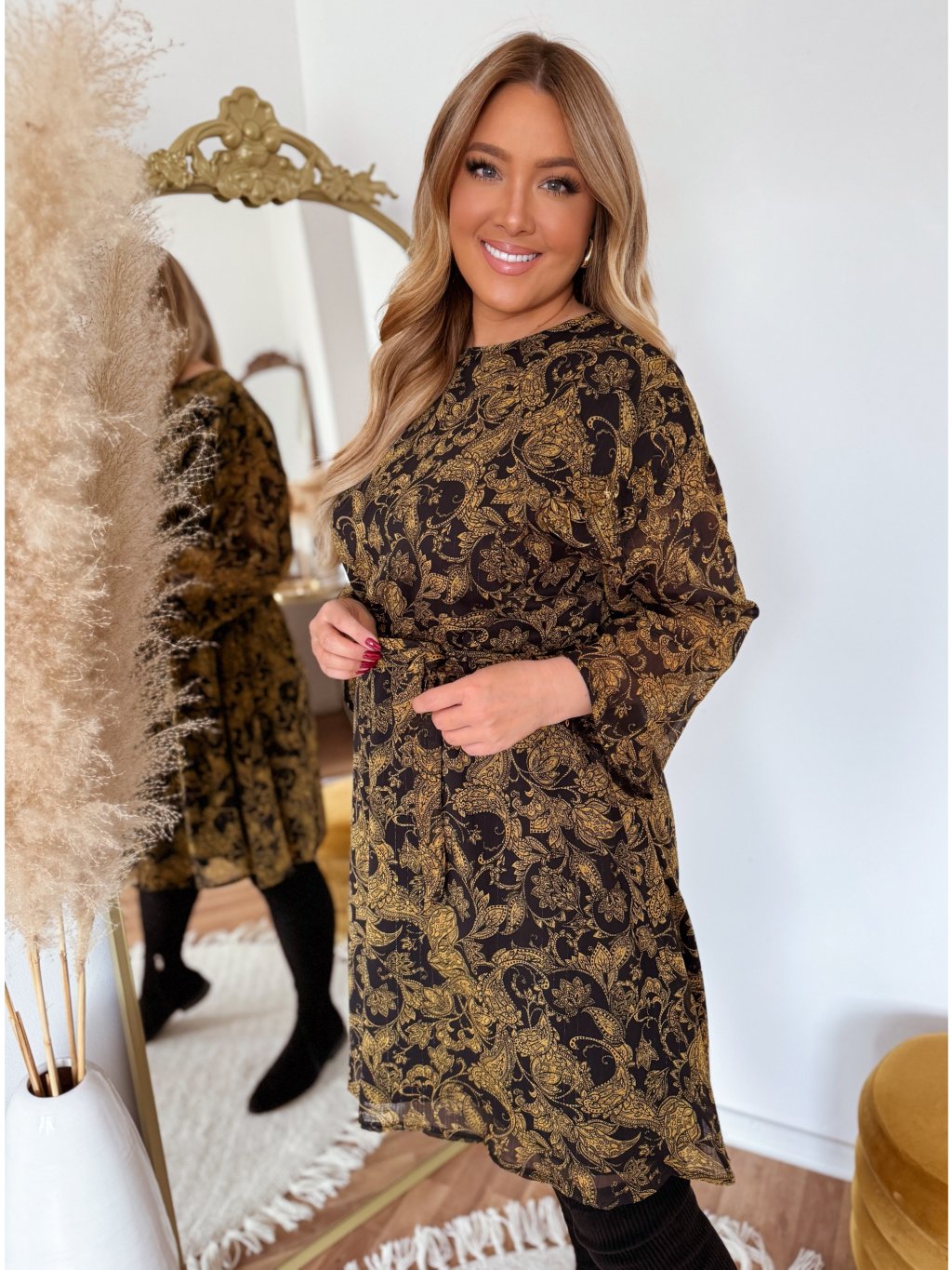 Krátke čierne šaty s gumičkou v páse a opaskom. Modelka meria 168 cm a má na sebe veľkosť XL/XXL.