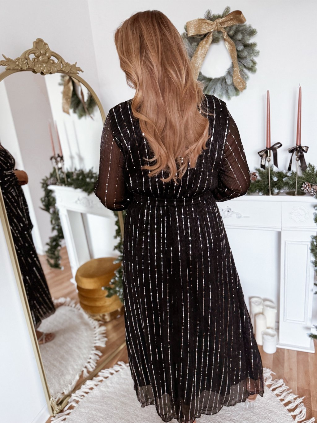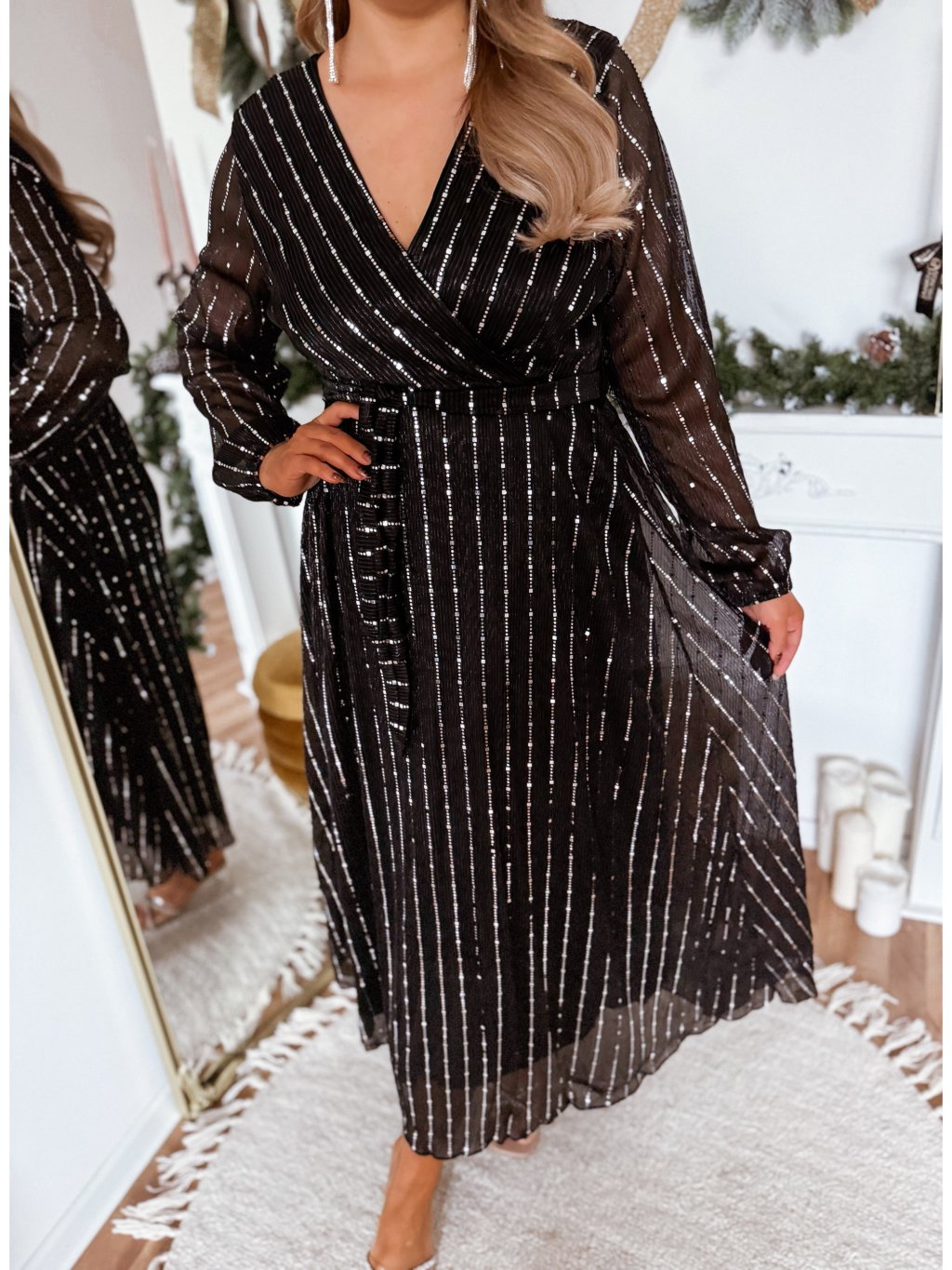 Dlhé spoločenské dámske šaty s gumičkou v páse a výstrihom do V. Na šatách sú našité strieborné trblietky . Modelka meria 168 cm a má na sebe veľkosť L/XL.