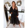 Dlhé spoločenské dámske šaty s gumičkou v páse a výstrihom do V. Na šatách sú našité strieborné trblietky . Modelka meria 168 cm a má na sebe veľkosť L/XL.
