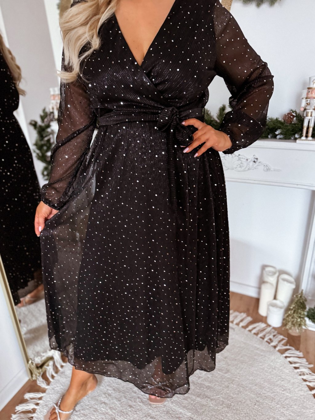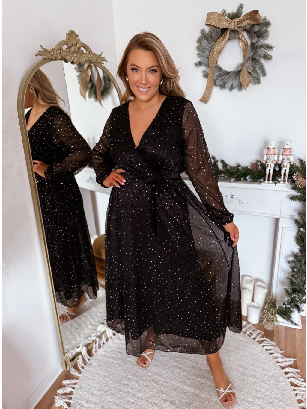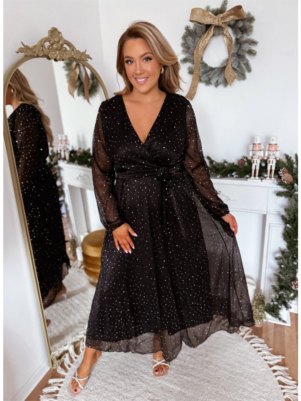Dlhé spoločenské dámske šaty s gumičkou v páse a výstrihom do V. Na šatách sú našité strieborné trblietky . Modelka meria 168 cm a má na sebe veľkosť XL/XXL.