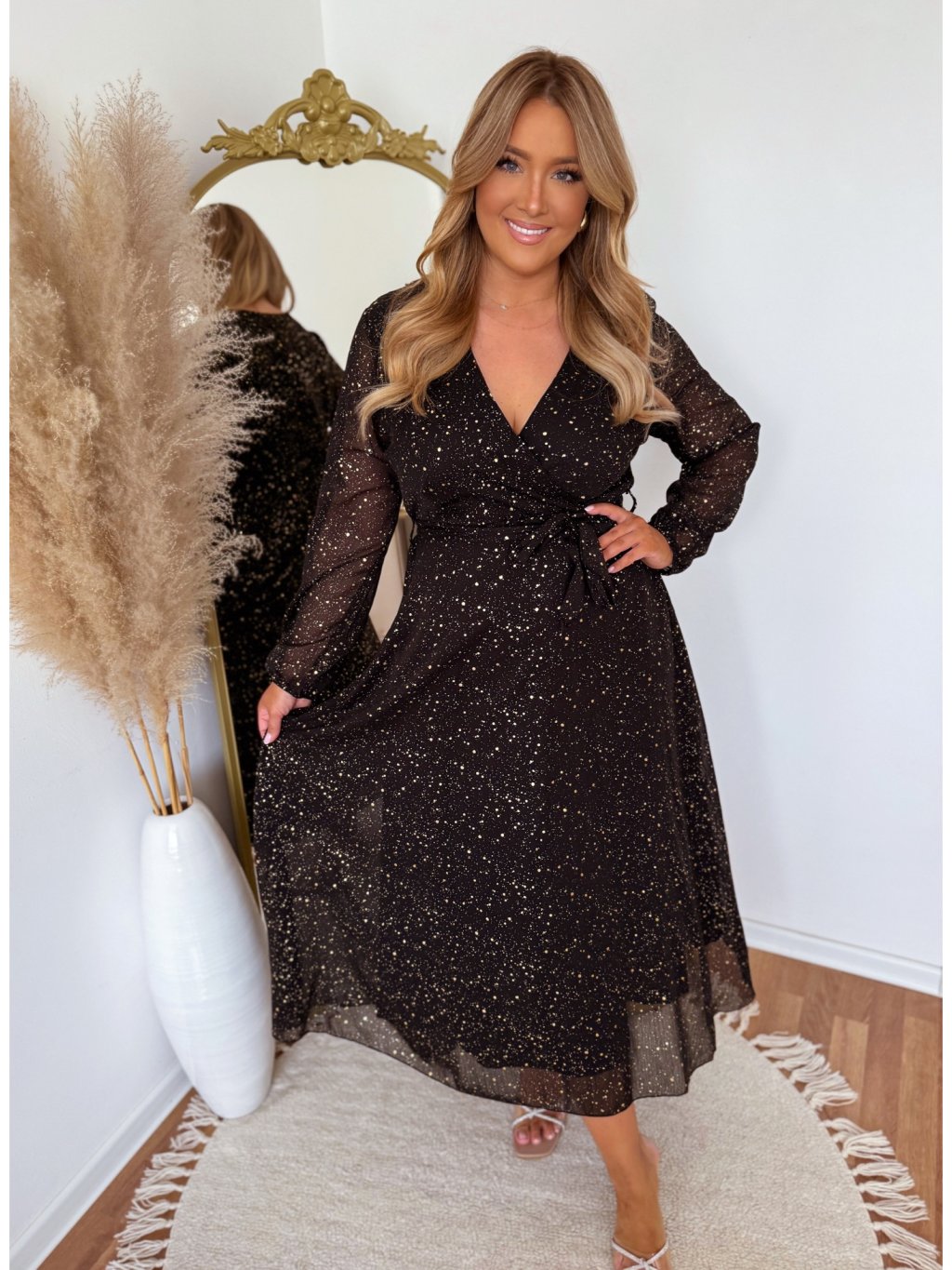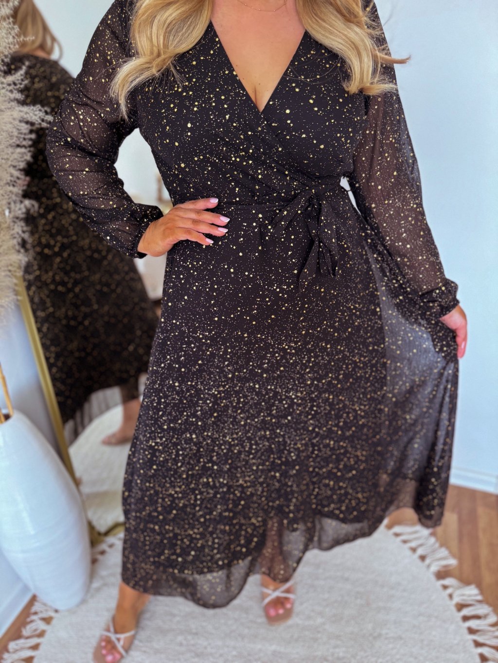 Dlhé elegantné dámske šaty majú zlatý vzor na látke. Majú gumičku v páse. Od pása nadol sú šaty voľné. Modelka meria 168 cm a má na sebe veľkosť XL/XXL.