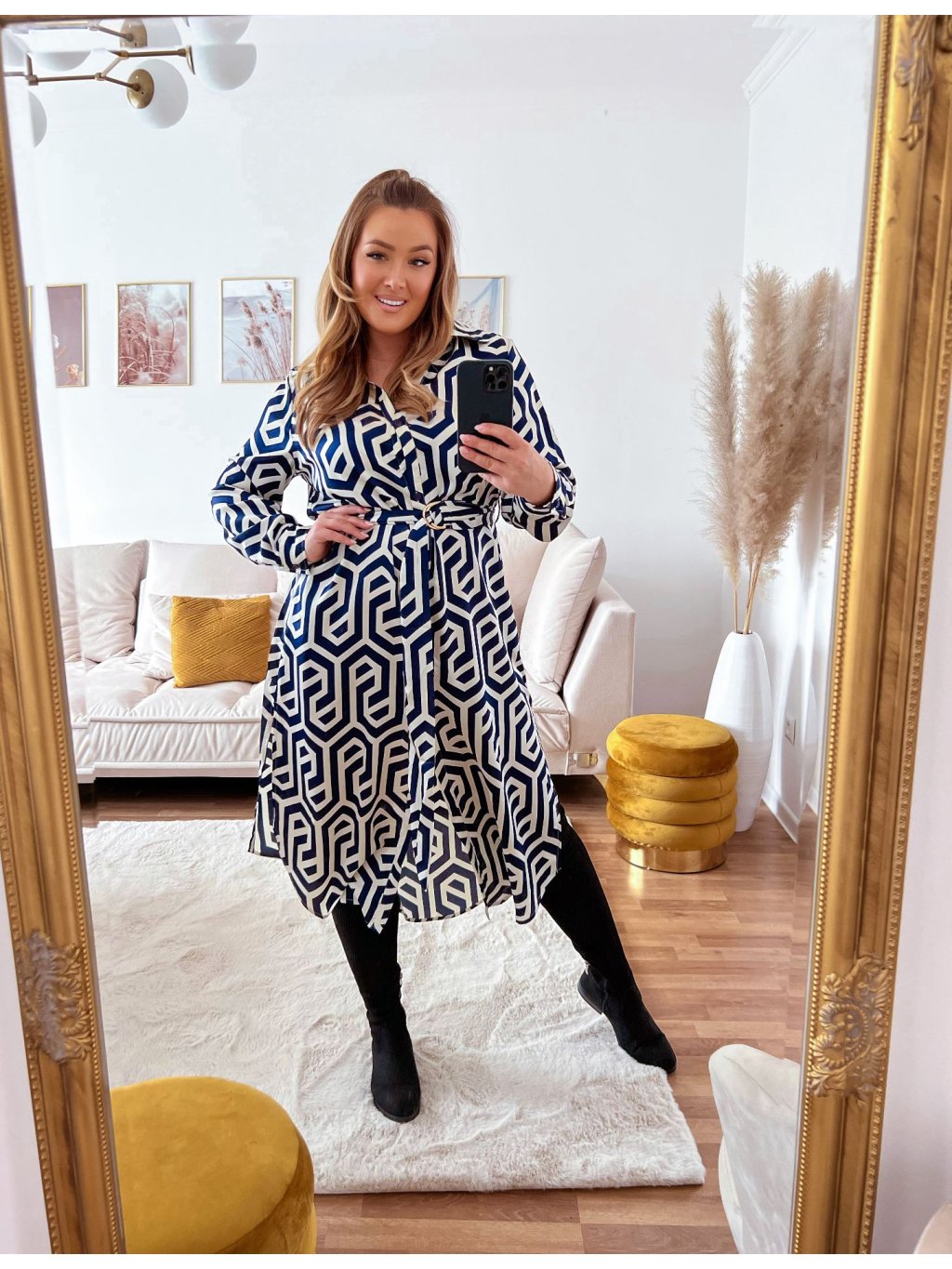 Košeľové šaty s opaskom v maslovej farbe s modrým vzorom. Šaty majú voľnejší strih a sťahujú sa opaskom v páse. Košeľové šaty sú vyrobené z hladkej látky. Táto látka nie je elastická. Modelka meria 168 cm a má na sebe veľkosť XL.