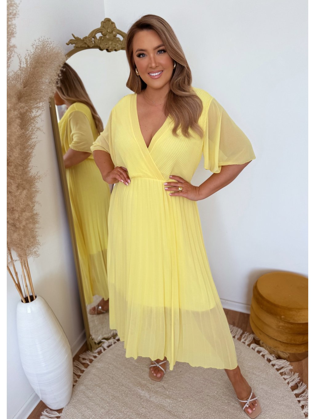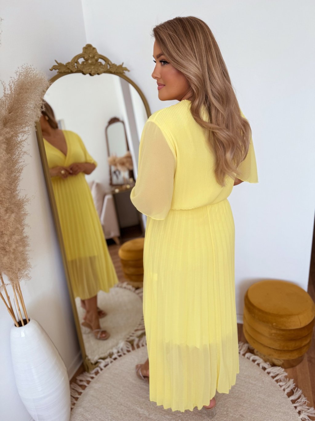 Elegantné plisované šaty s krátkym rukávom. Šaty majú voľnejší strih a elastickú gumičku v páse. Modelka meria 168 cm a má na sebe veľkosť XL/XXL.
