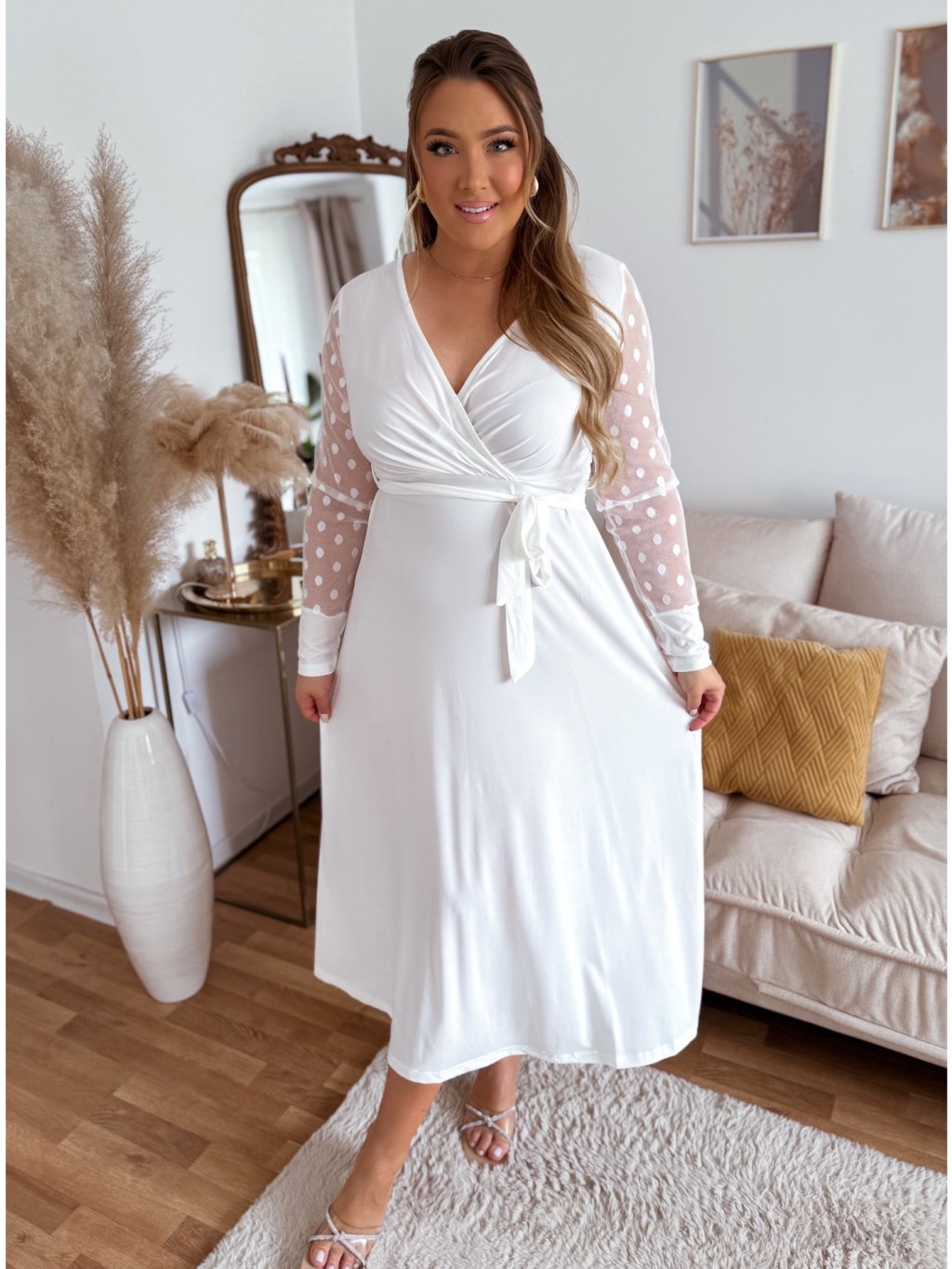 Elegantné biele šaty pre moletky s dlhým bodkovaným rukávom. Dámske šaty sú veľmi elastické a prispôsobia sa postave, rukávy sú priehľadné. Modelka meria 168 cm a má na sebe veľkosť XL.