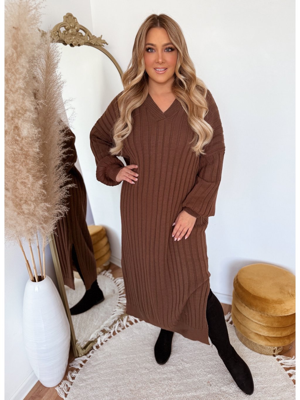 Úplne voľné svetrové šaty sú elastické a prispôsobia sa postave. Odporúčame ich stiahnúť opaskom v páse, opasok nie je súčasťou šiat, nájdete ho medzi doplnkami. Modelka meria 168 cm a má na sebe veľkosť L.