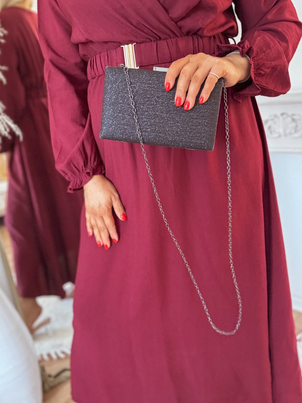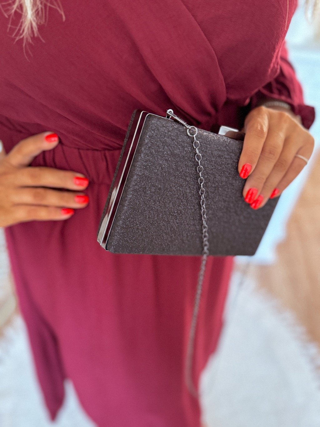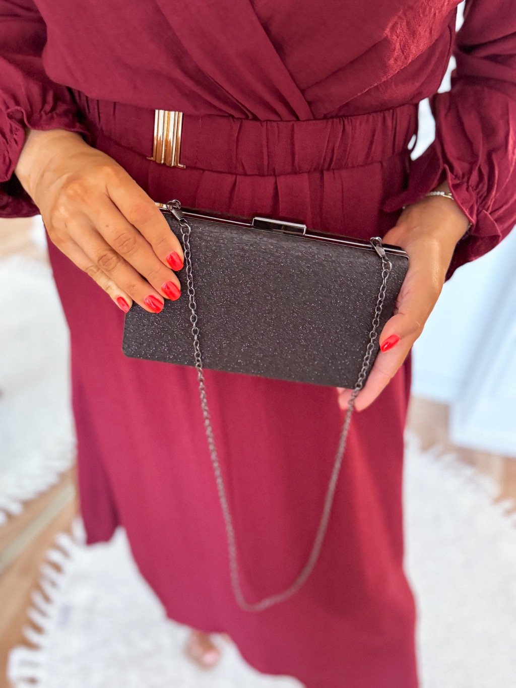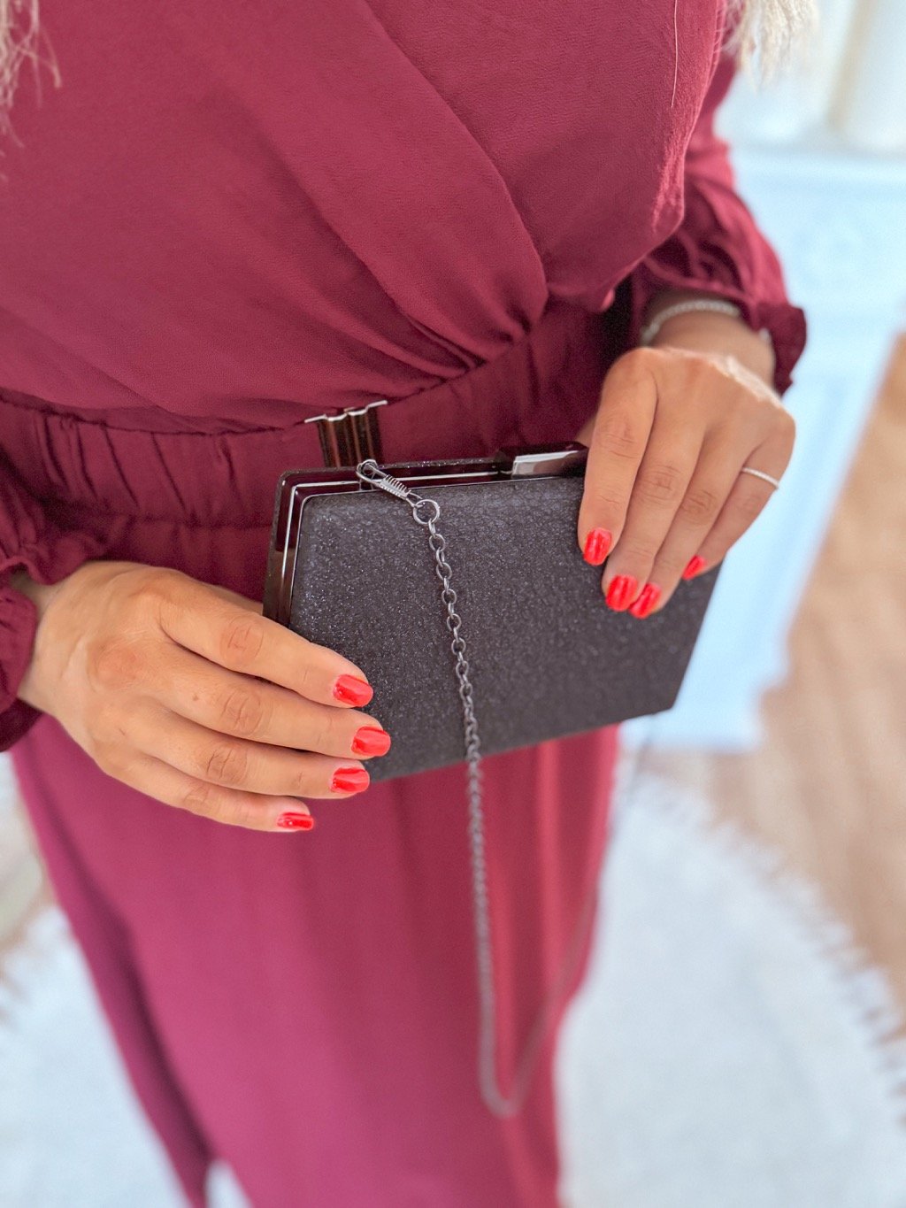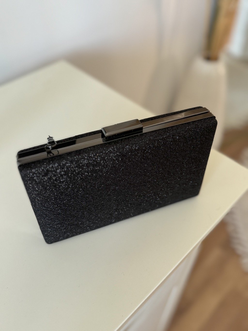 Táto štýlová listová kabelka v trblietavo čiernom odtieni je ideálnym doplnkom na spoločenské udalosti, svadby či večerné oslavy. Povrch s trblietavým efektom pôsobí luxusne a elegantne, zatiaľ čo zlaté kovové zapínanie a retiazkové ramienko dodávajú kabelke moderný šmrnc.