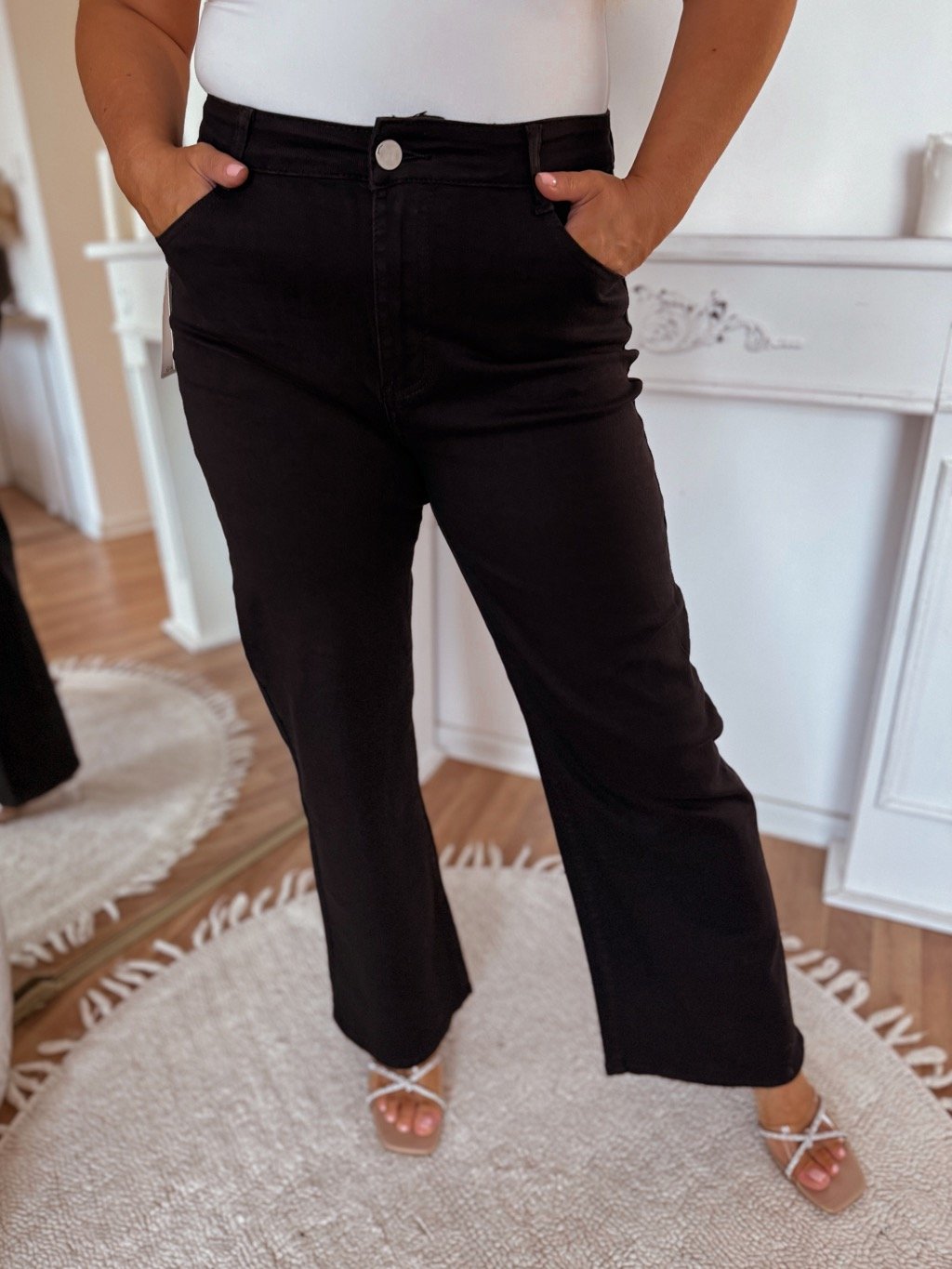 Elastické rifle pre moletky s vreckami a vysokým pásom. Nohavice sa prispôsobia postave. Modelka meria 168 cm a má na sebe veľkosť 44.
