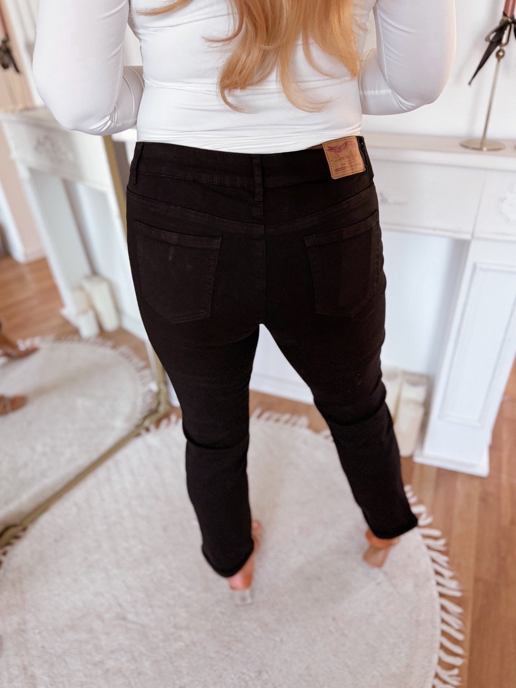 Elastické rifle s vreckami a vysokým pásom. Nohavice sa prispôsobia postave. Modelka meria 168 cm a má na sebe veľkosť 44.