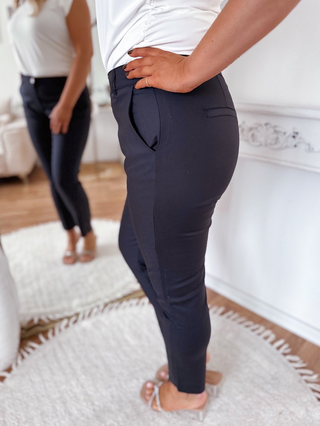 Elastické bavlnené chino nohavice s vysokým pásom pre moletky, vreckami a zapínaním na zips. Modelka meria 168 cm a ma na sebe veľkosť 44.