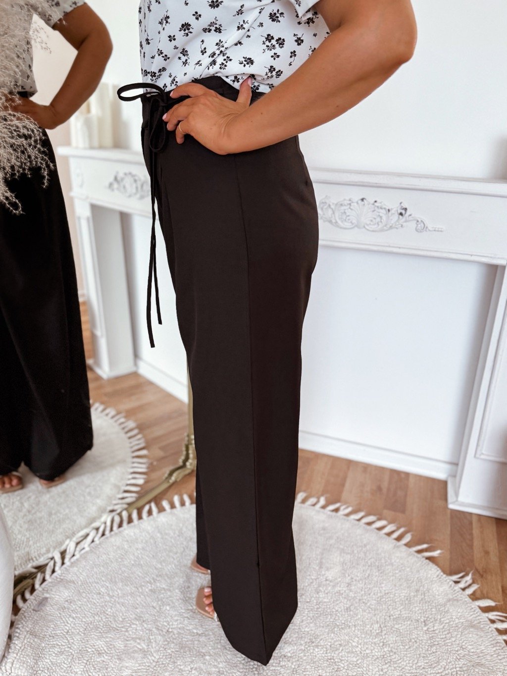 Elgantné dámske čierne pre moletky nohavice sú mierne elastické, maju viazanie na boku. Modelka meria 168 cm a má na sebe veľkosť XL.