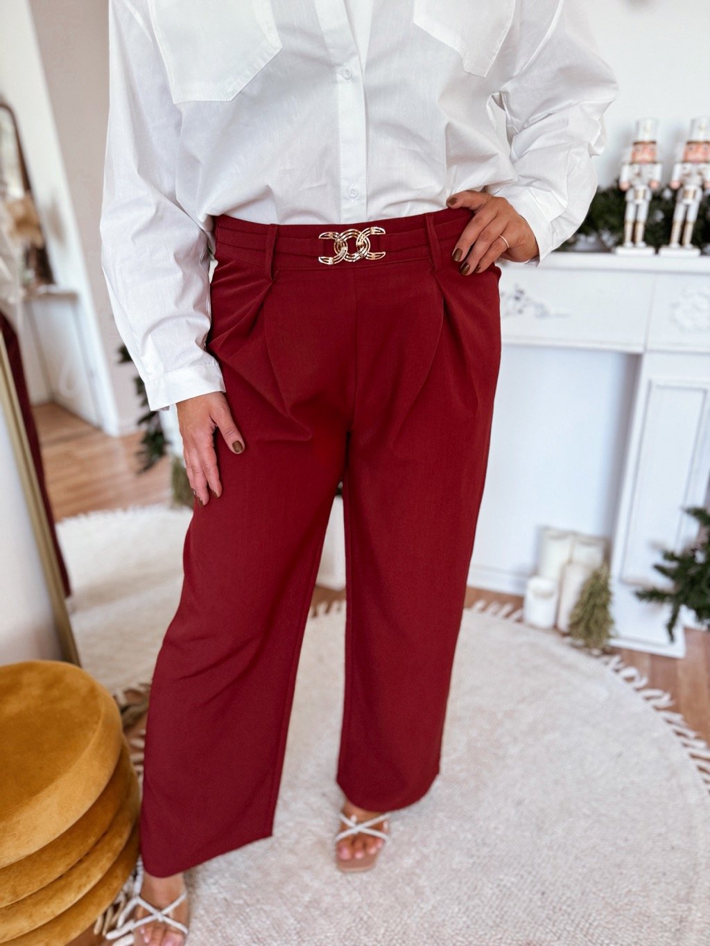 Elgantné nohavice sú mierne elastické, majú zips na chrbte a našitý opasok. Ak sa rozhodujete medzi dvoma veľkosťami, odporúčame zvoliť väčšiu veľkosť. Modelka meria 168 cm a má na sebe veľkosť XXL.
