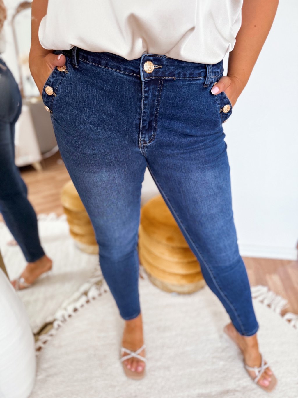 Elastické džínsy s vreckami a vysokým pásom. Nohavice sa prispôsobia postave. Modelka meria 168 cm a má na sebe veľkosť 44.