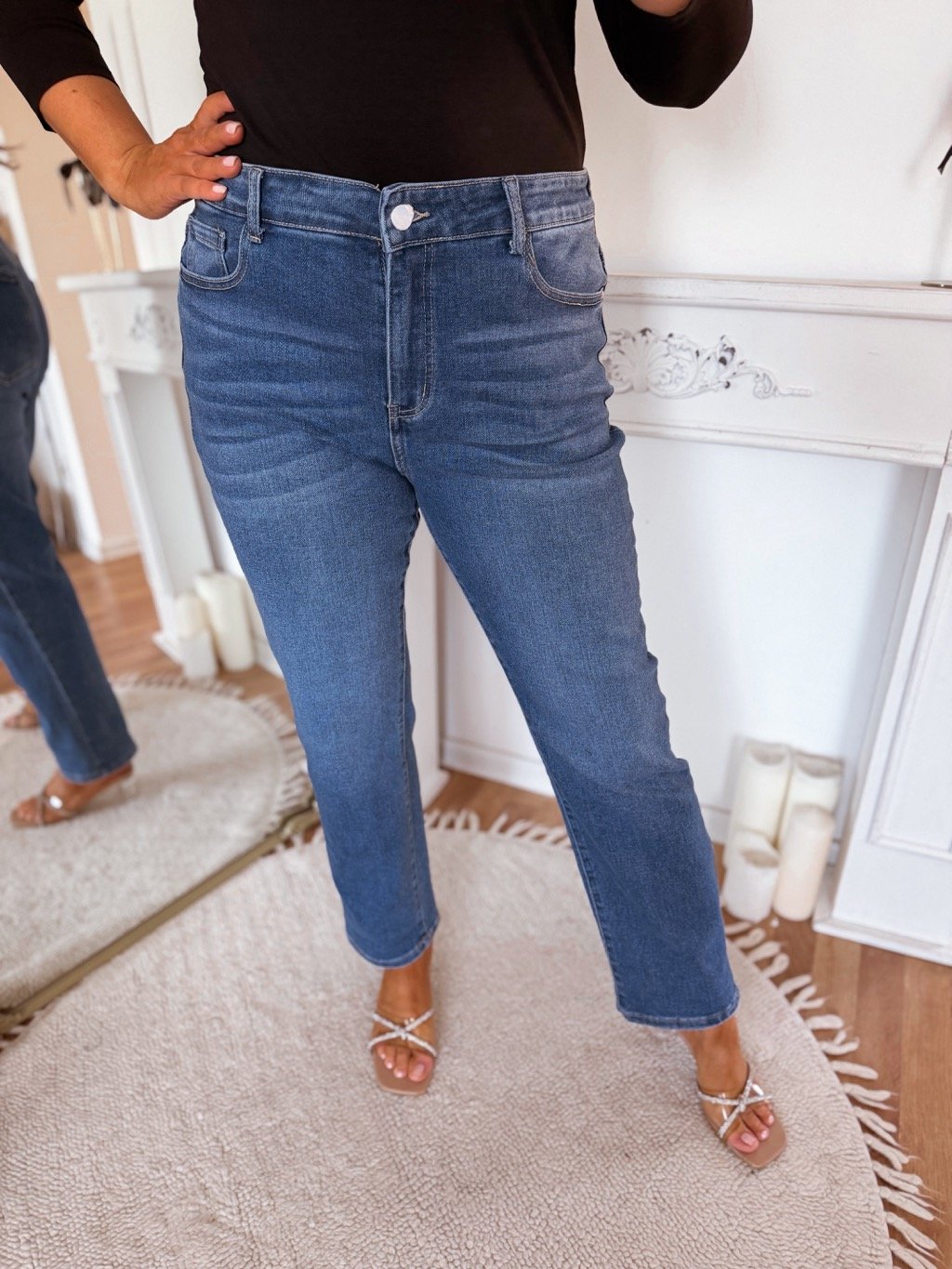 Elastické rifle s vreckami a vysokým pásom. Nohavice sa prispôsobia postave. Modelka meria 168 cm a má na sebe veľkosť 44.