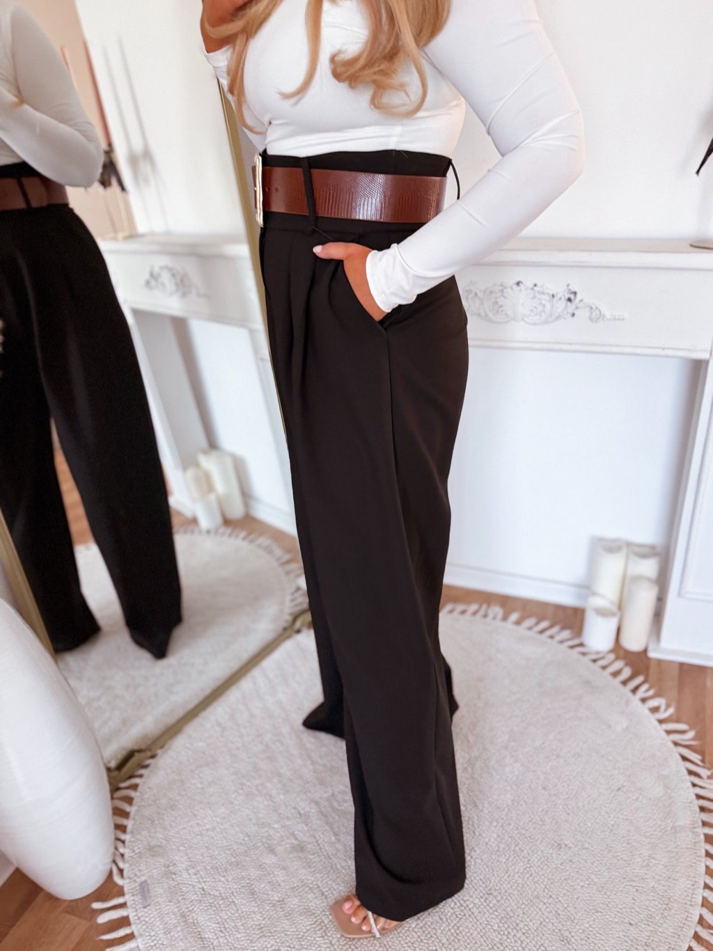 Voľné široké nohavice s výrazným hnedým opaskom. Modelka meria 168 cm a má na sebe veľkosť 44.