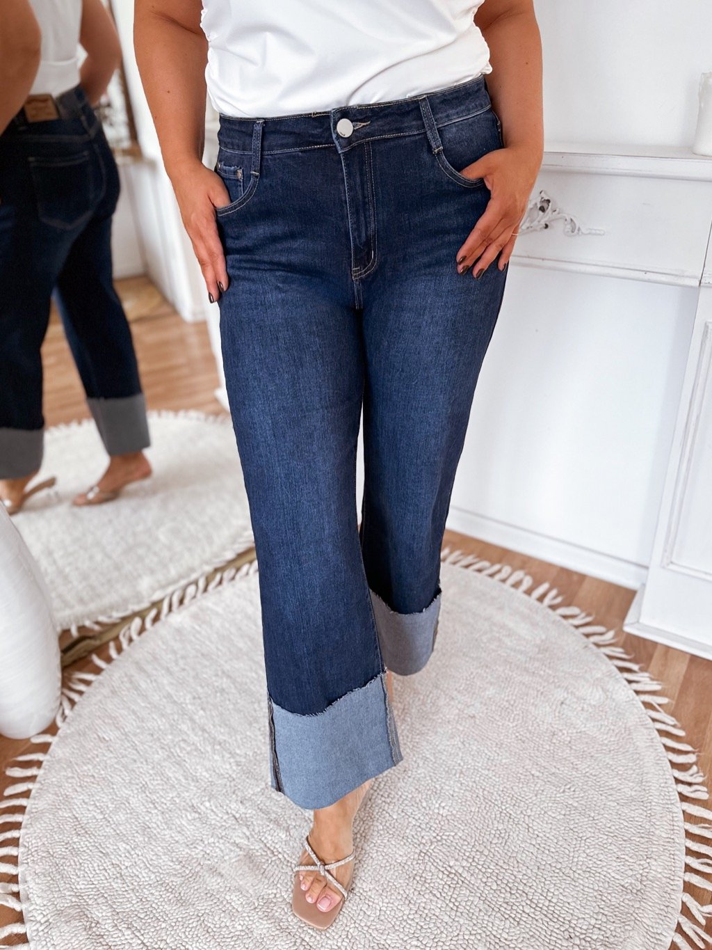 Tmavomodré rifle s rozšíreným strihom a výrazným kontrastným lemom sú štýlovým kúskom, ktorý oživí každý šatník. Vyšší pás krásne zvýrazní postavu a pohodlný denim zabezpečí komfort počas celého dňa. Spodný lem vo svetlejšom odtieni dodáva rifliam originálny vzhľad. Ideálne k tričku, blúzke či saku – na bežný deň aj neformálny večer. Modelka meria 168 cm a má na sebe veľkosť 44.
