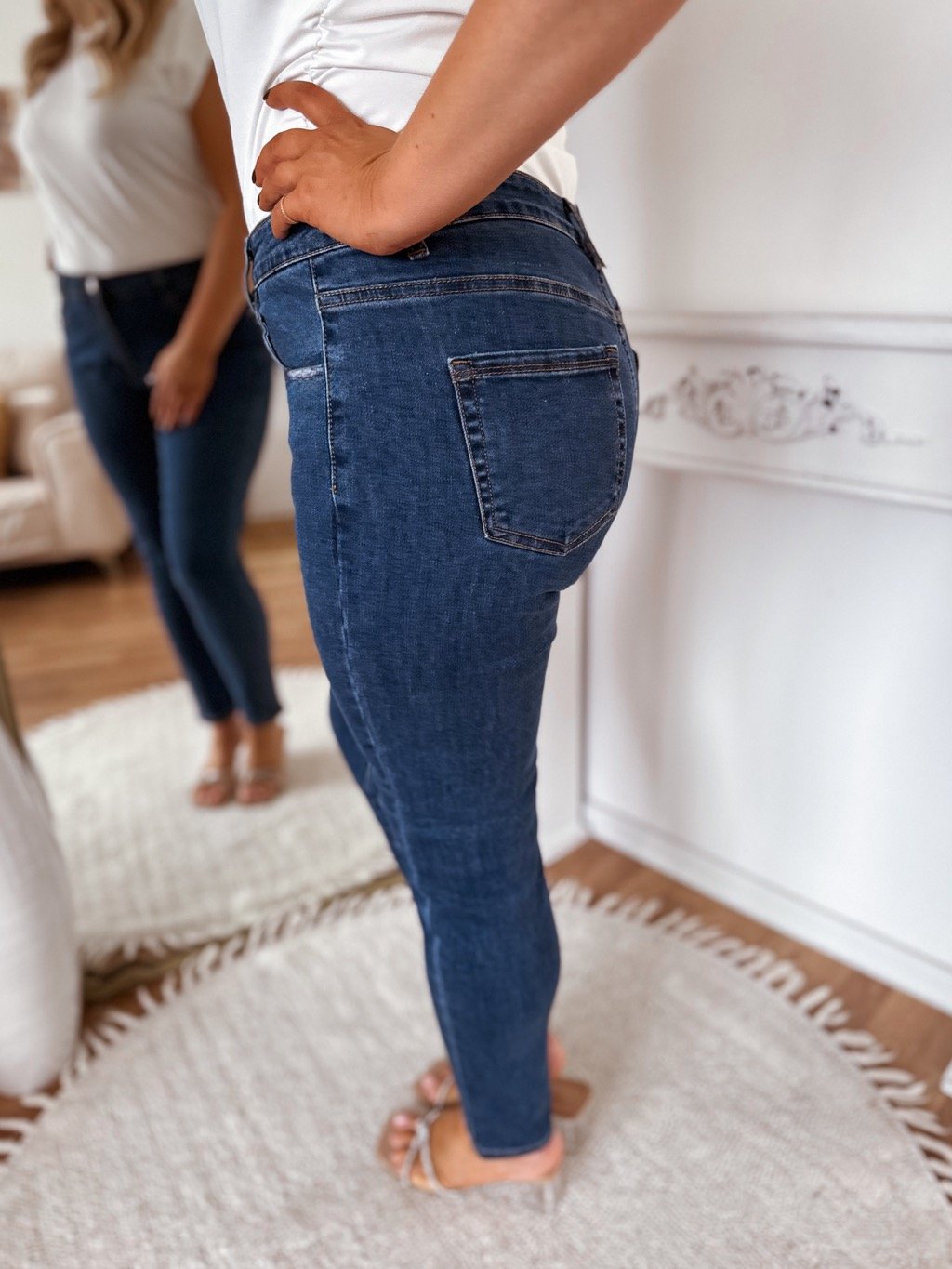 Tmavomodré džínsy s vysokým pásom a skinny nohavicami pre moletky sú vyrobené z elastického denimu, ktorý sa prispôsobí postave a zabezpečí pohodlie počas celého dňa. Univerzálny strih ľahko skombinujete s elegantným topom aj ležérnym tričkom. Modelka meria 168 cm a má na sebe veľkosť 44.