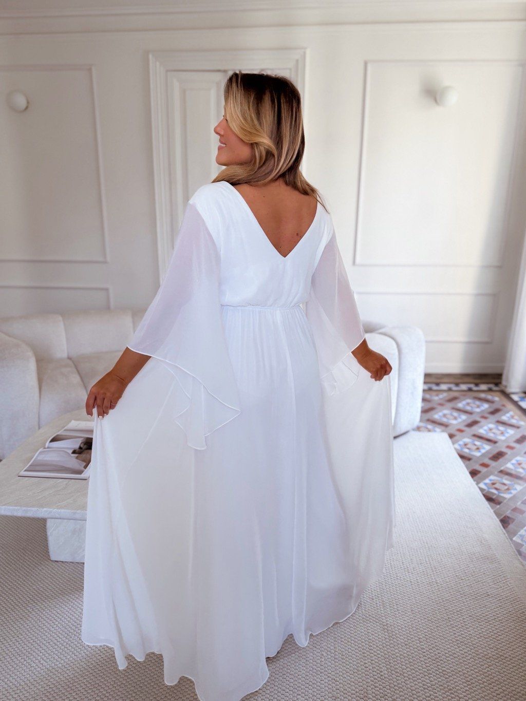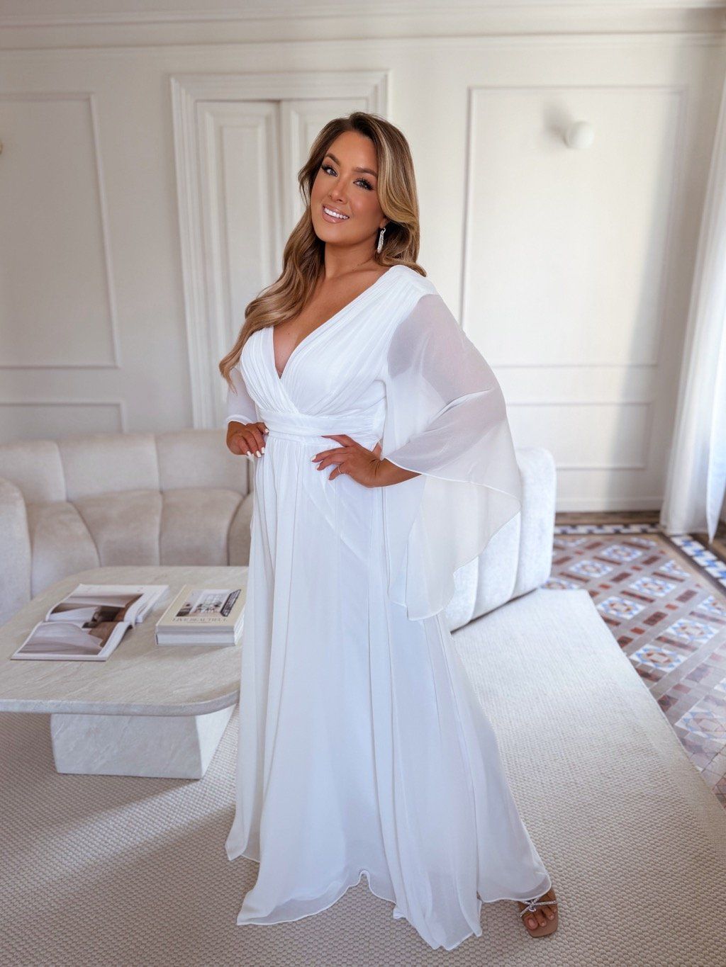 Dlhé spoločenské šaty s hlbokým výstrihom a výrazným dramatickým rukávom. Spoločenské šaty pre moletky majú všitú elastickú gumičku v páse zo zadnej strany. Sukňa je úplne voľná. Modelka meria 168 cm a má na sebe veľkosť XL (42).