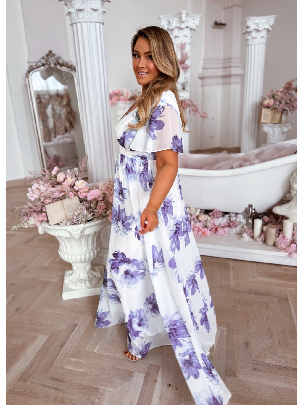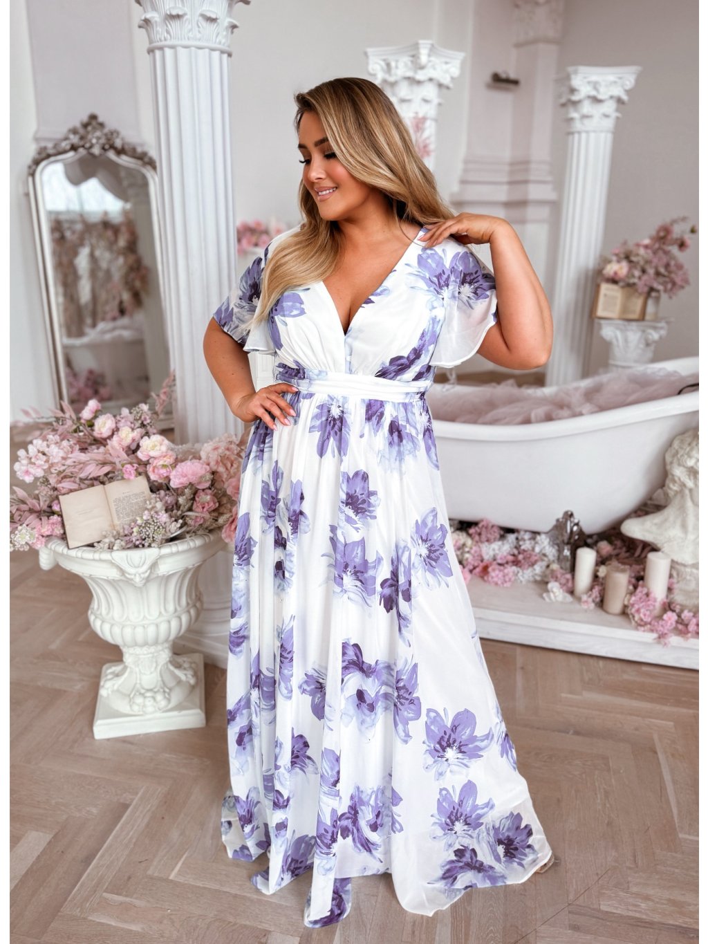 Dlhé bielo kvetovanénspoločenské šaty s krátkym rukávom pre moletky majú elastickú gumičku v páse. Modelka meria 168 cm a má na sebe veľkosť XL (42).