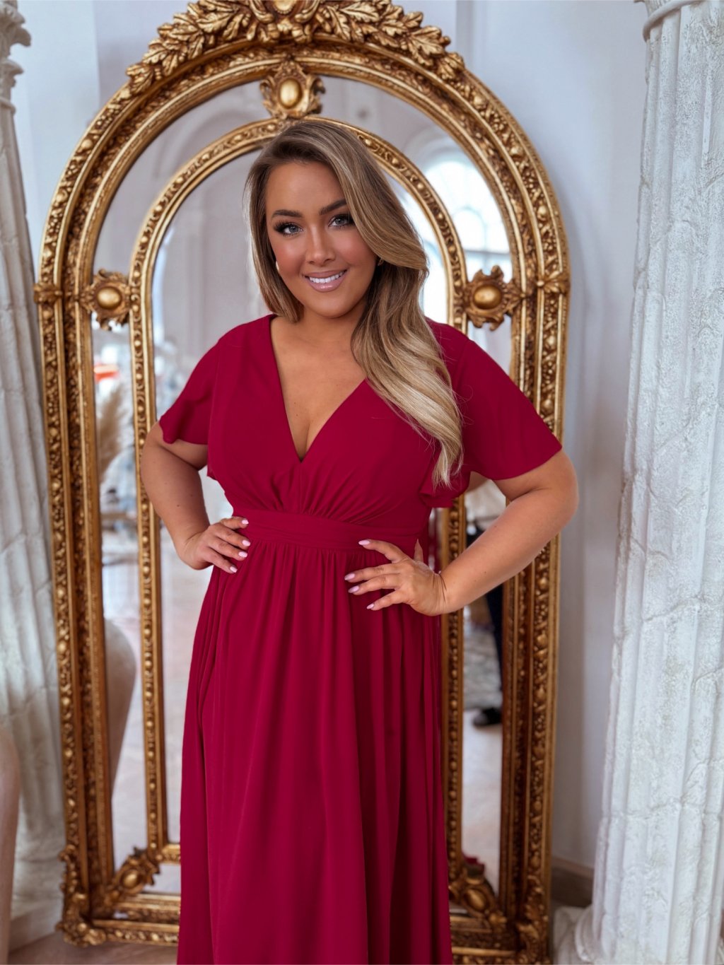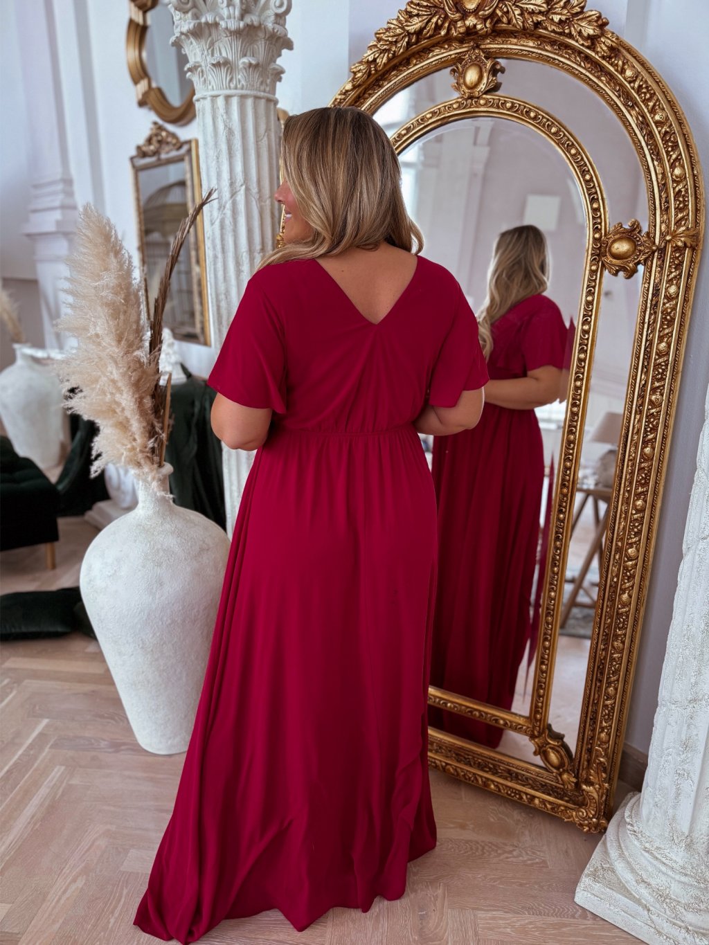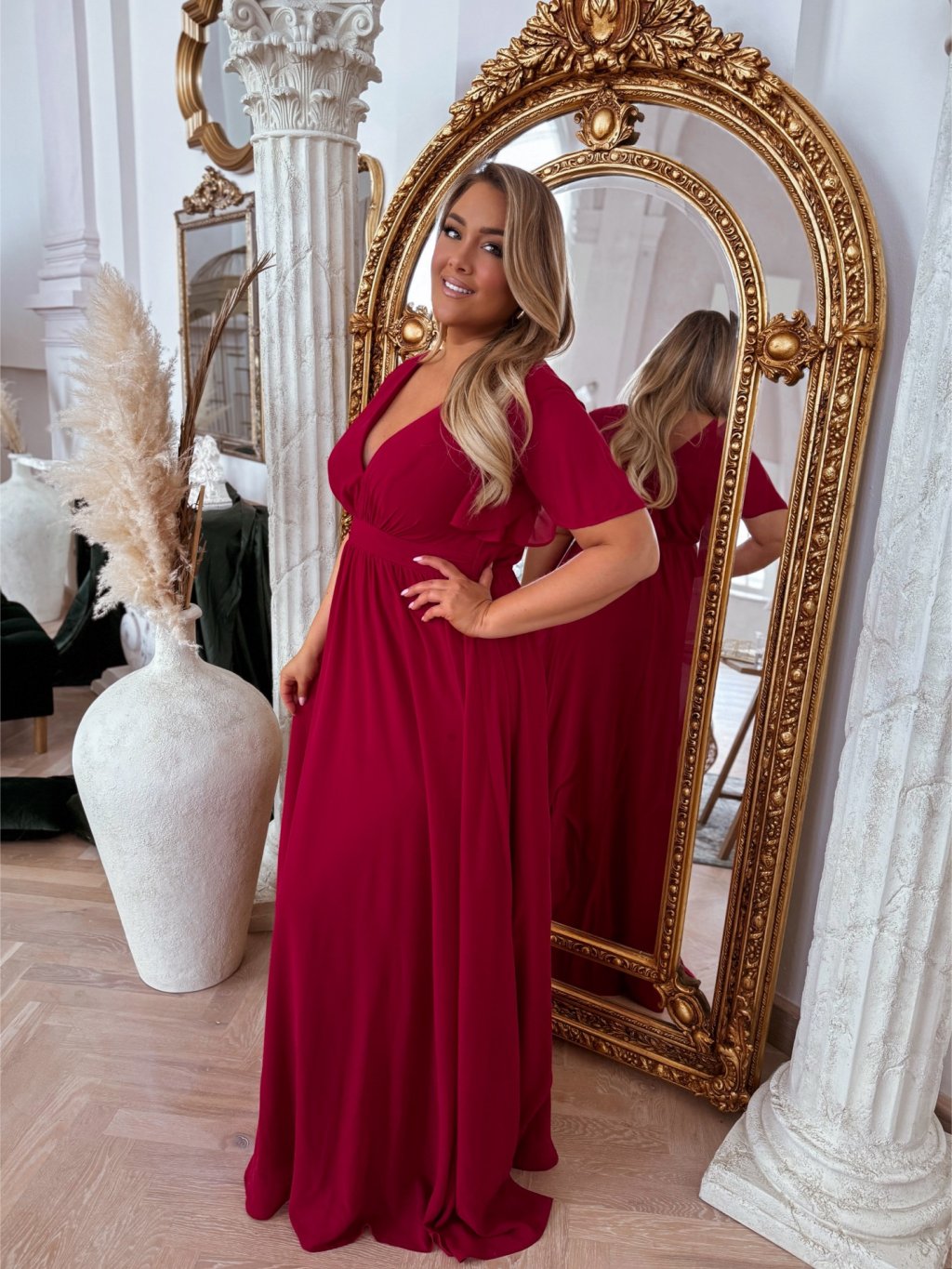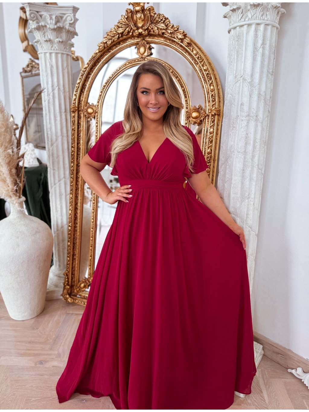 Dlhé spoločenské šaty s krátkym rukávom majú elastickú gumičku v páse a voľnú sukňu. Modelka meria 168 cm a má na sebe veľkosť XL (42).