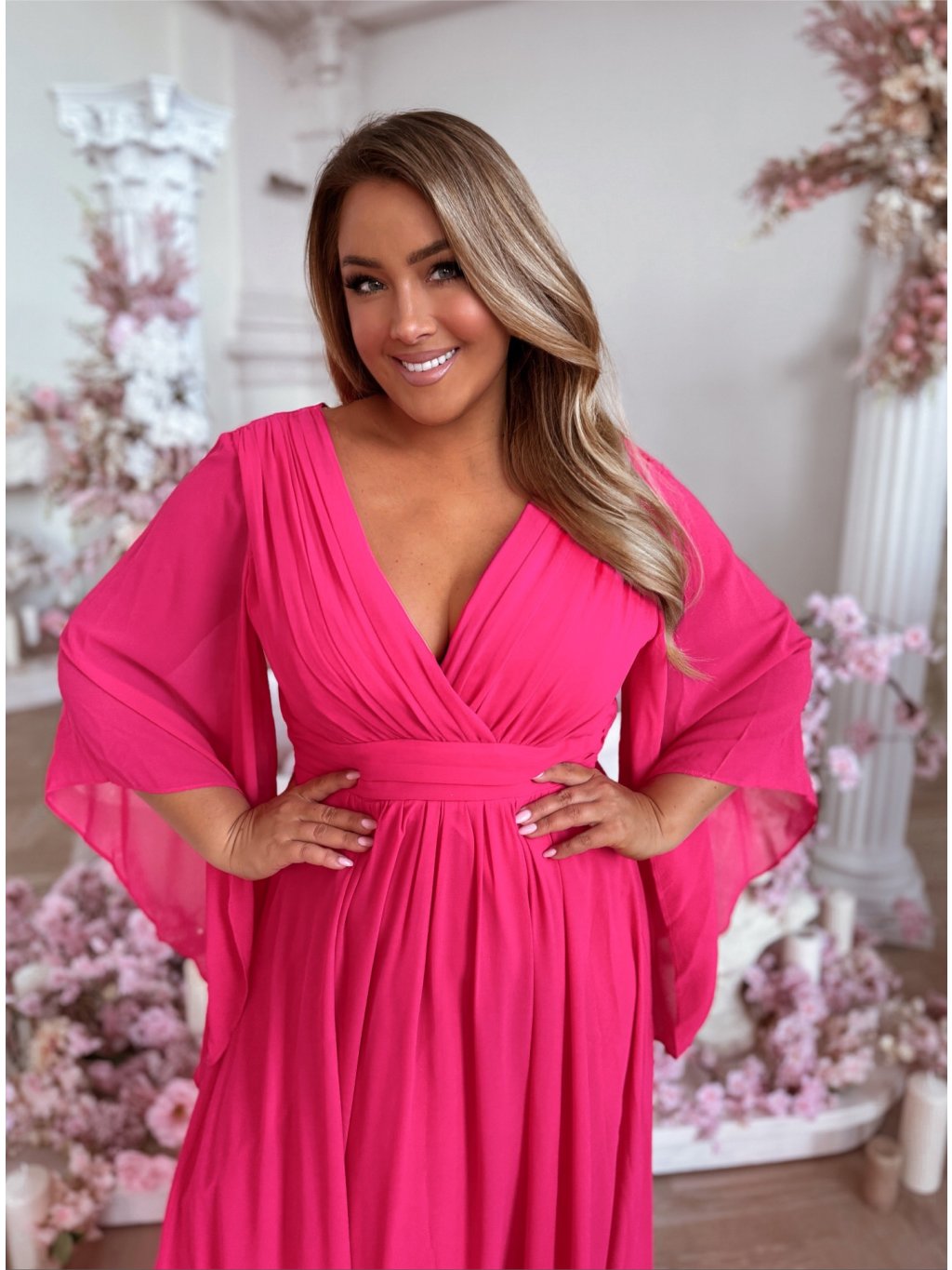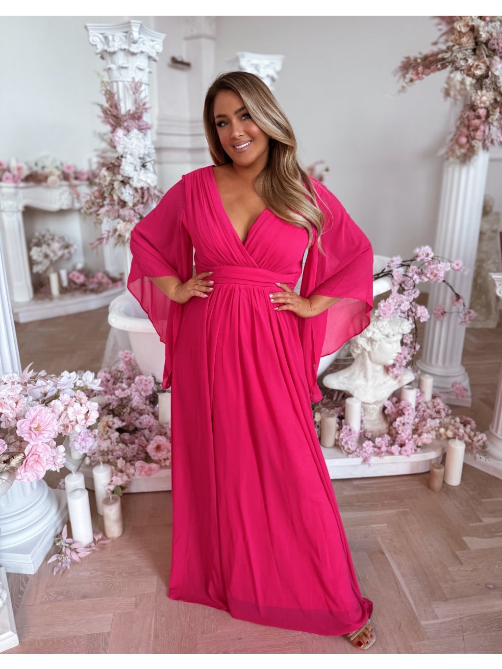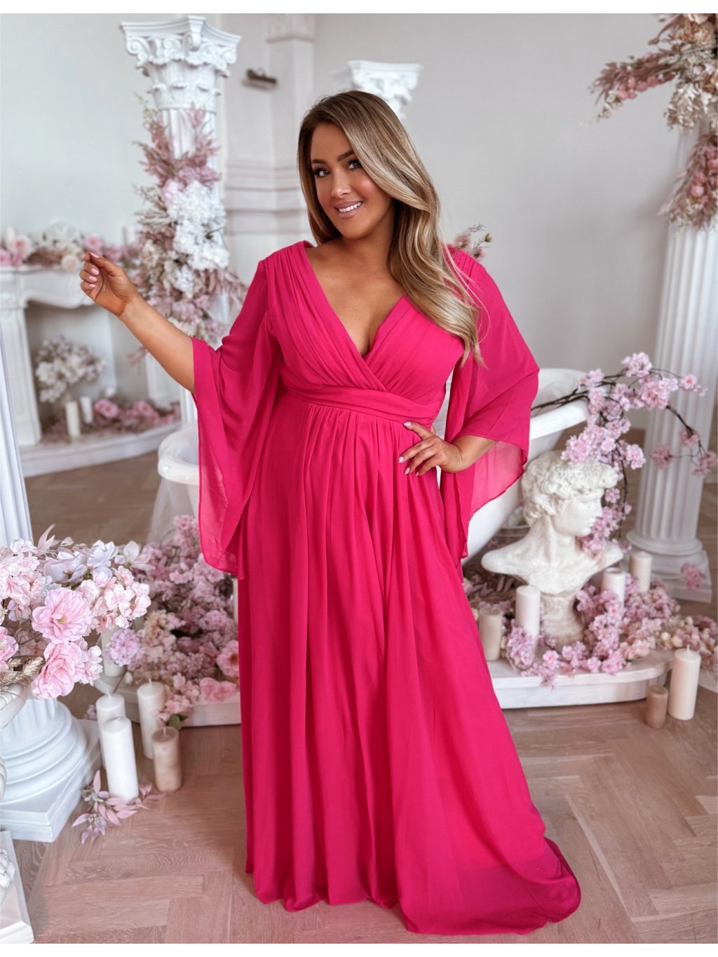 Dlhé spoločenské šaty s hlbokým výstrihom a výrazným dramatickým rukávom. Spoločenské šaty pre moletky majú všitú elastickú gumičku v páse zo zadnej strany. Sukňa je úplne voľná. Modelka meria 168 cm a má na sebe veľkosť XL (42).
