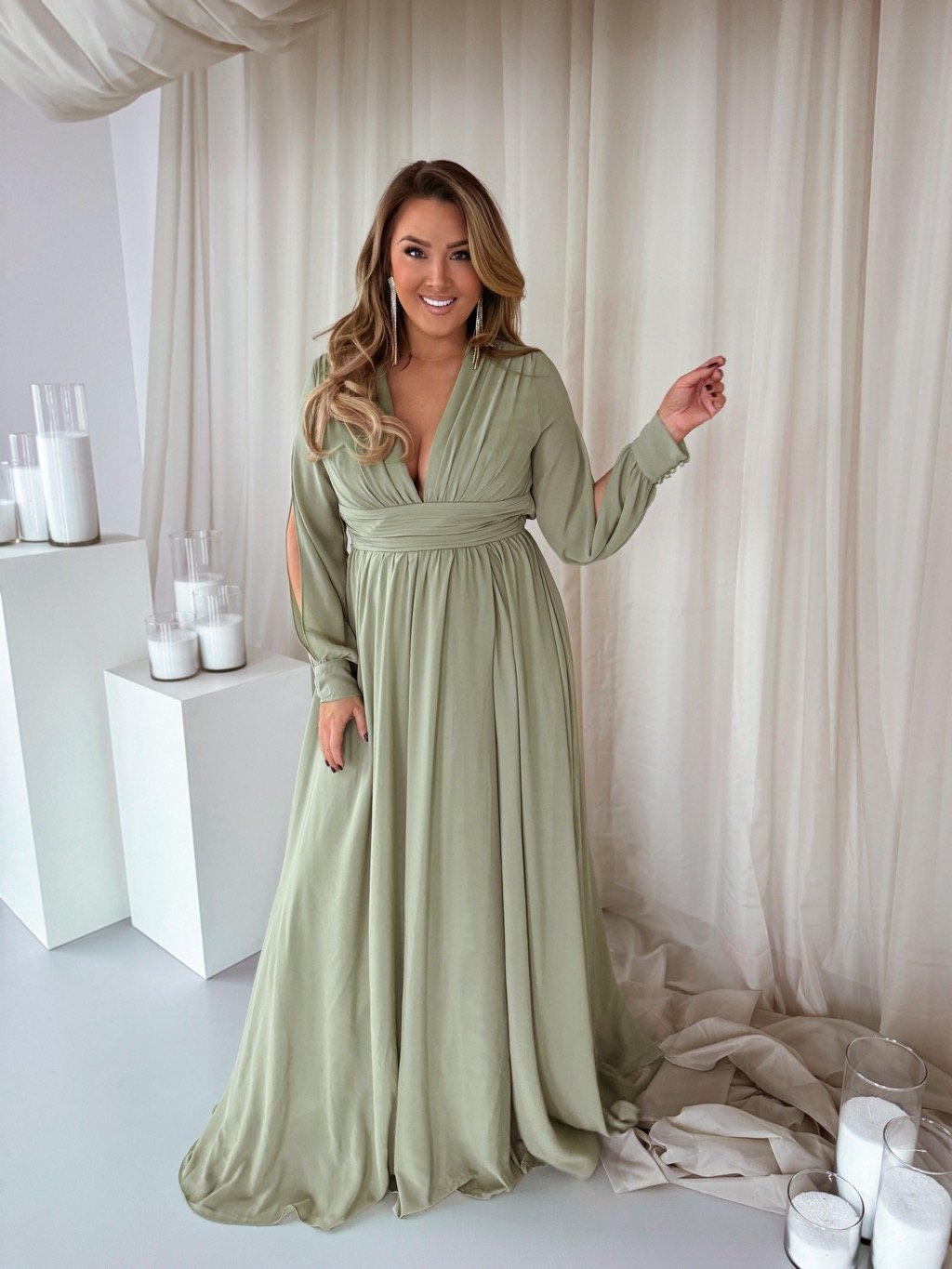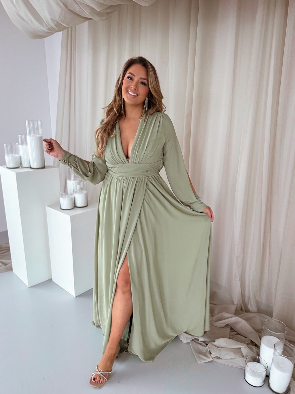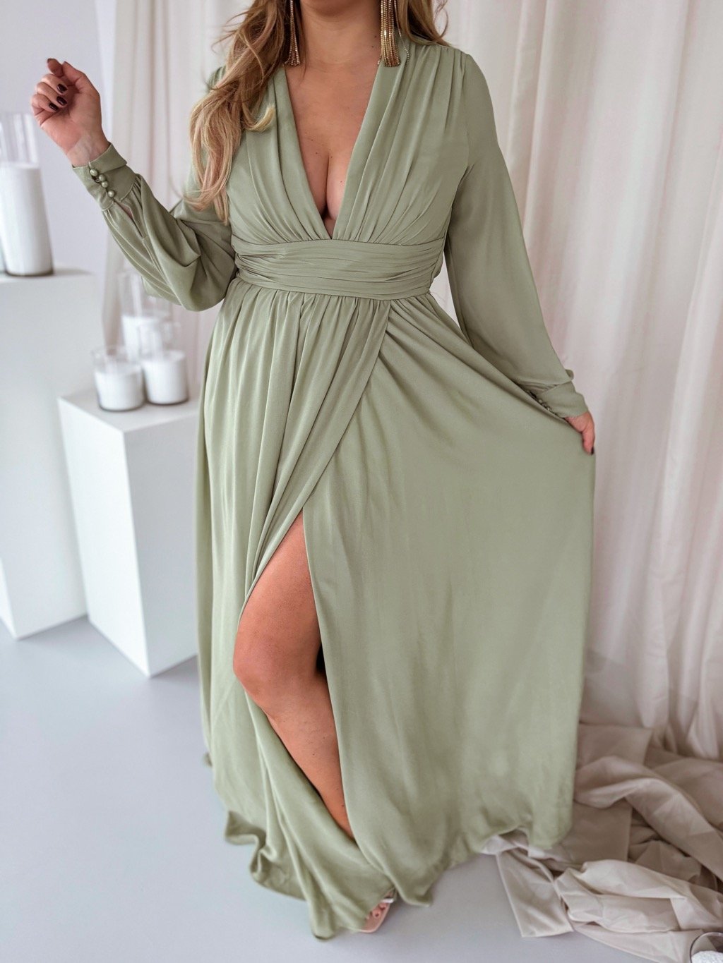 Dlhé bledo zelené spoločenské šaty s veľmi hlbokým výstrihom, výrazným rázporkom a dlhým rukávom. Spoločenské šaty pre moletky majú všitú elastickú gumičku v páse zo zadnej strany. Sukňa je úplne voľná. Modelka meria 168 cm a má na sebe veľkosť XL (42).