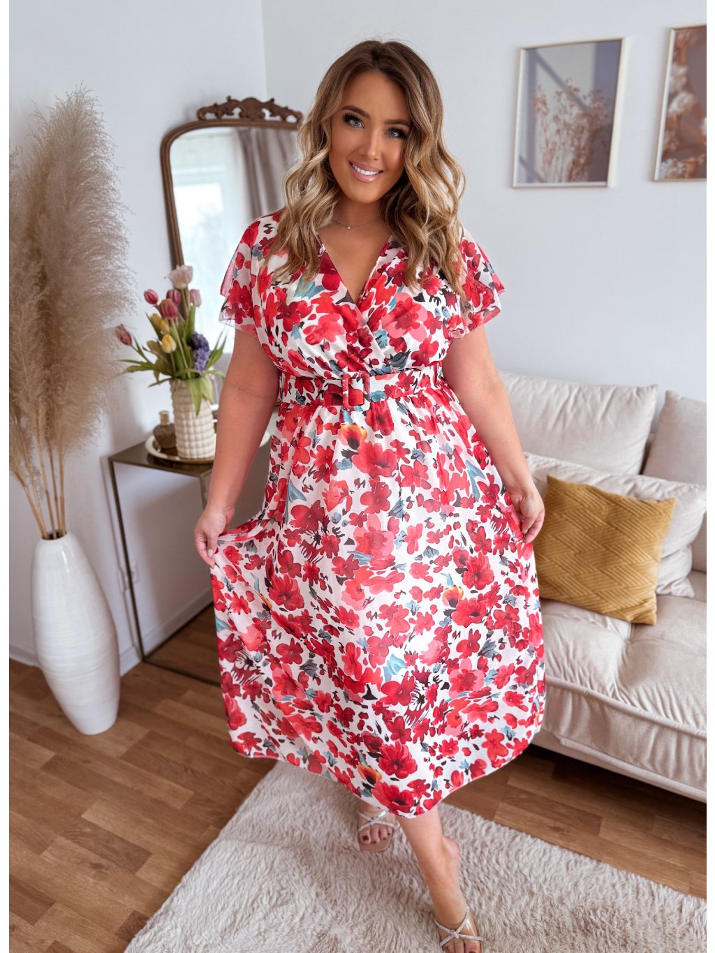 Elegantné dlhé šaty s krátkym rukávom a voľnou sukňou. Šaty majú voľný strih, v páse je všitá elastická gumička, k šatám je pribalený aj opasok. Modelka meria 168 cm a má na sebe veľkosť L/XL.
