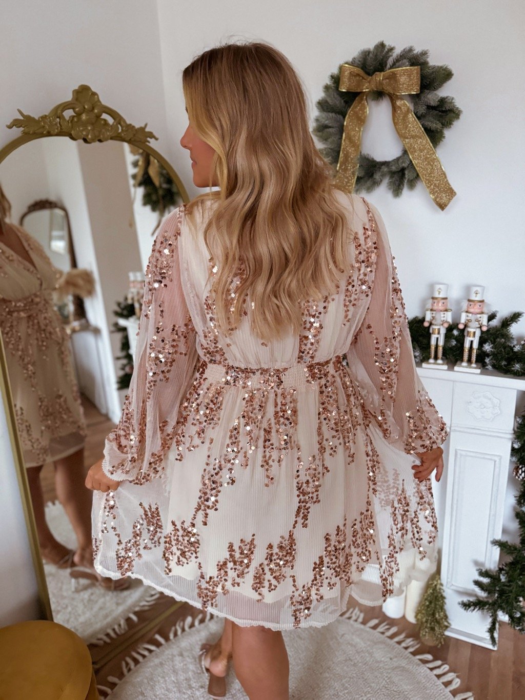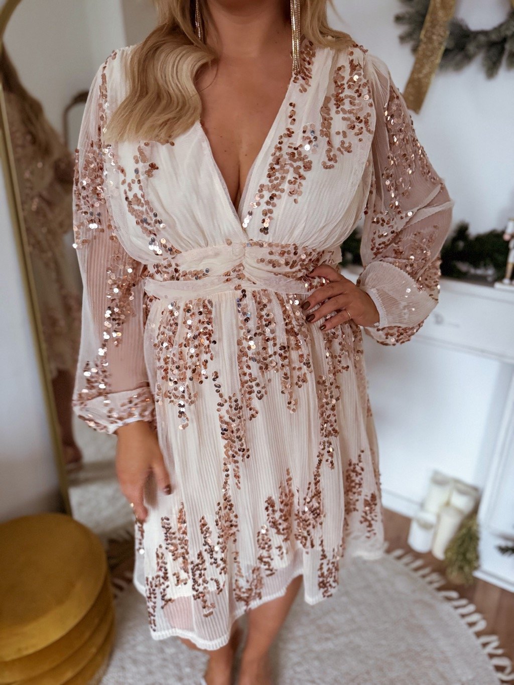 Krátke béžovo-zlaté šaty pre moletky majú gumičku v páse, boky majú voľný strih.  Modelka meria 168 cm a má na sebe veľkosť XL.