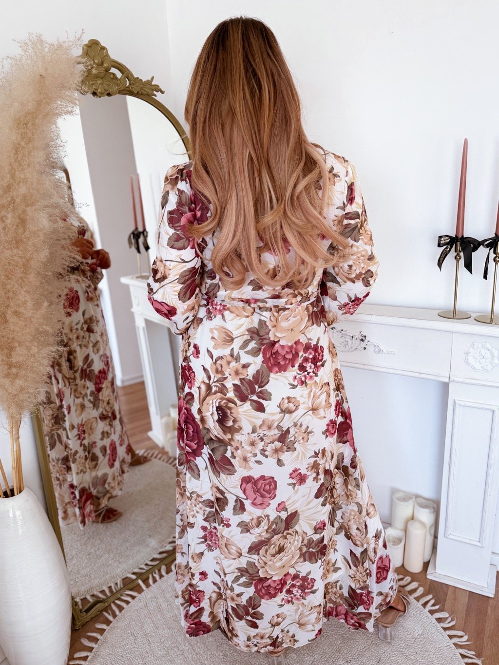 Spoločenské šaty s dlhým rukávom a voľnou sukňou. Šaty sa sťahujú opaskom v páse, od pása nadol sú tieto šaty úplne voľné. Modelka meria 168 cm a má na sebe veľkosť L/XL.