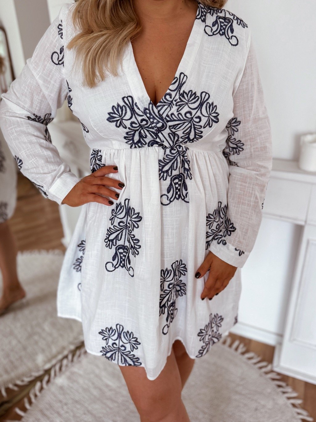Krátke šaty s gumičkou v páse a dlhým rukávom. Modelka meria 168 cm a má na sebe veľkosť L/XL.