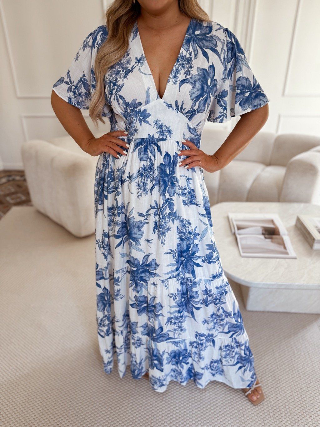 Biele šaty s modrými kvetmi