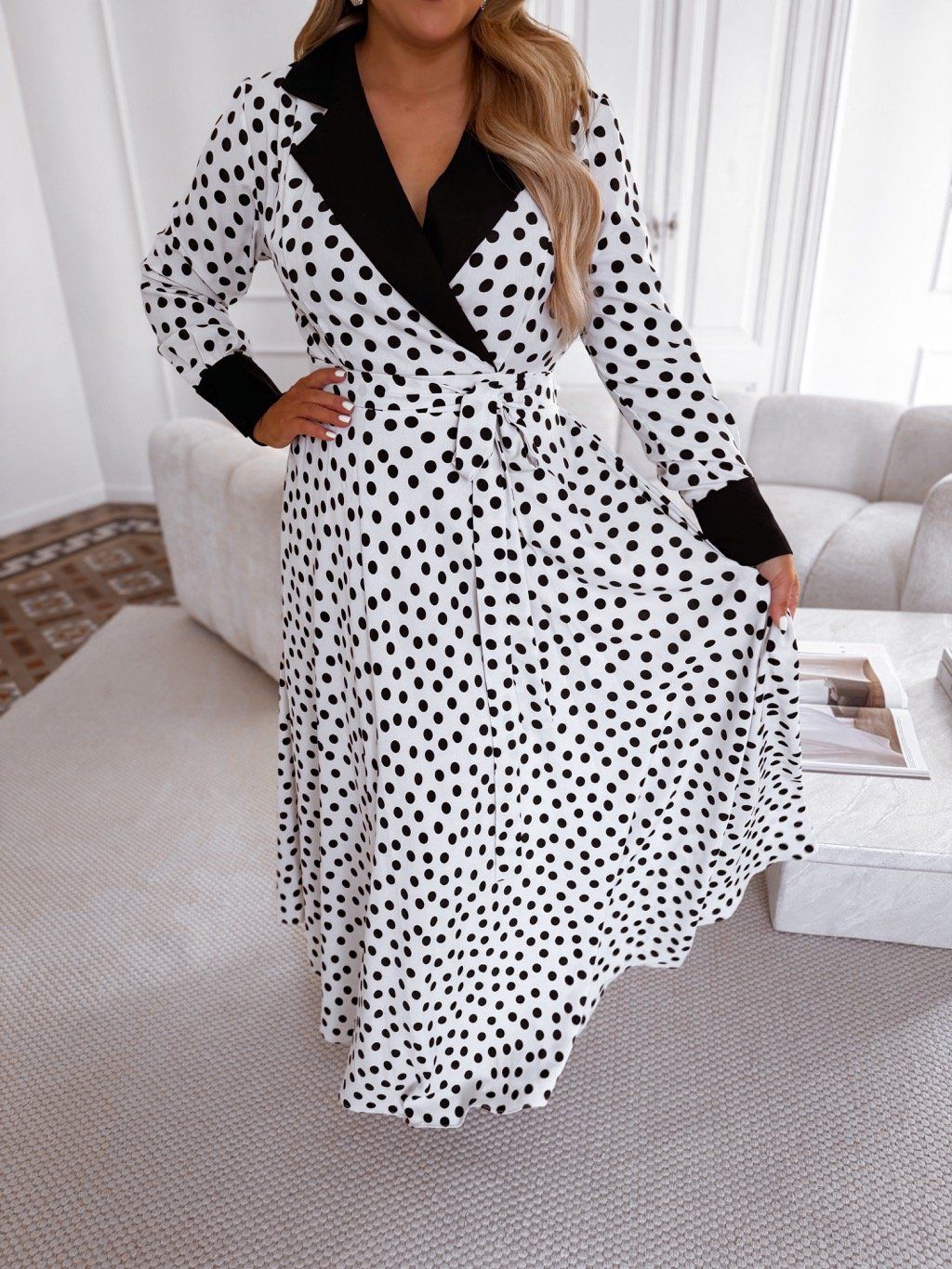 Elegantné šaty s dlhým rukávom sú zúžene v páse kde je našitá elastická gumička. Sukňa na šatách má úplne voľný strih. Modelka meria 168 cm a má na sebe veľkosť XL (44).