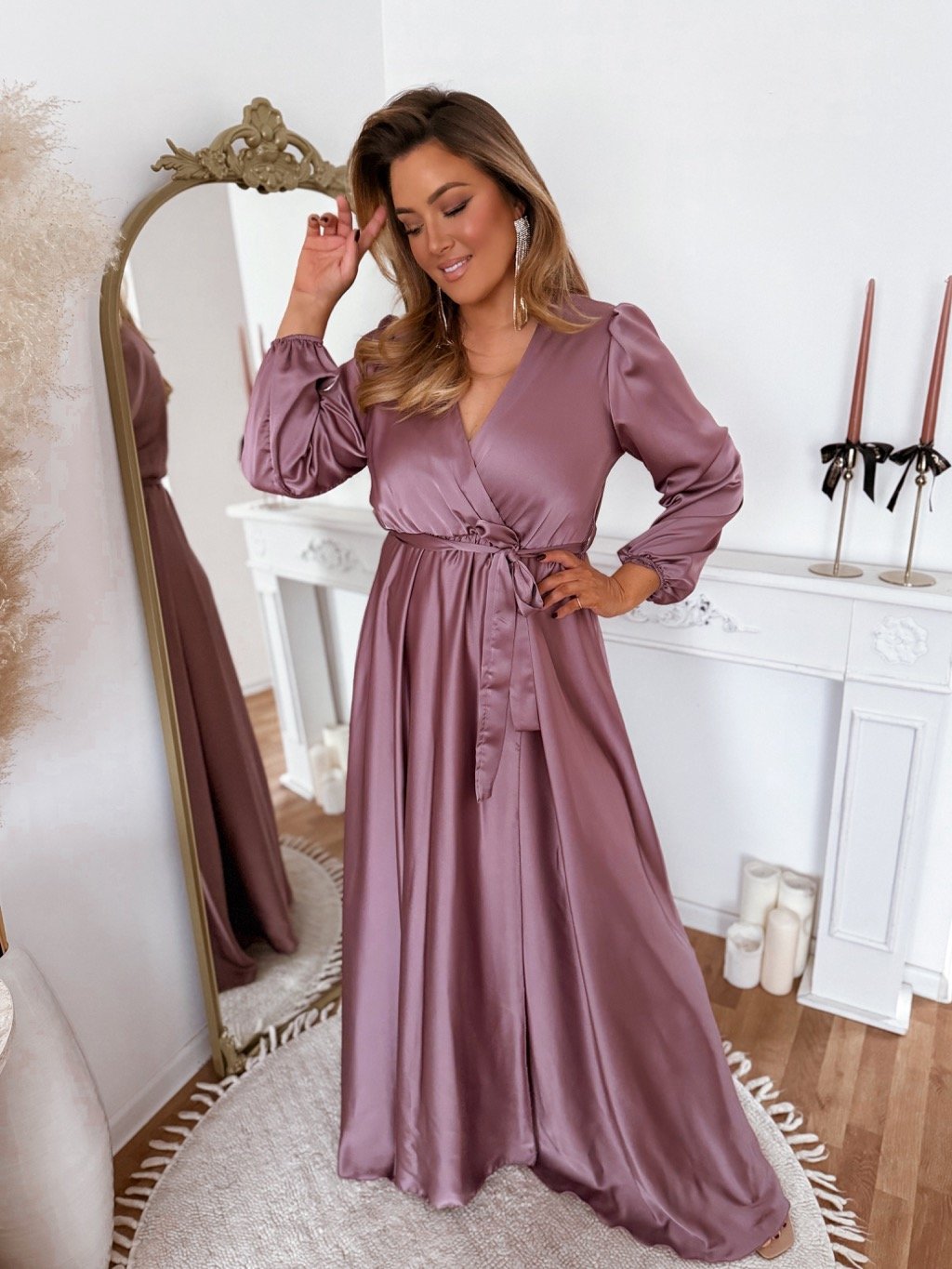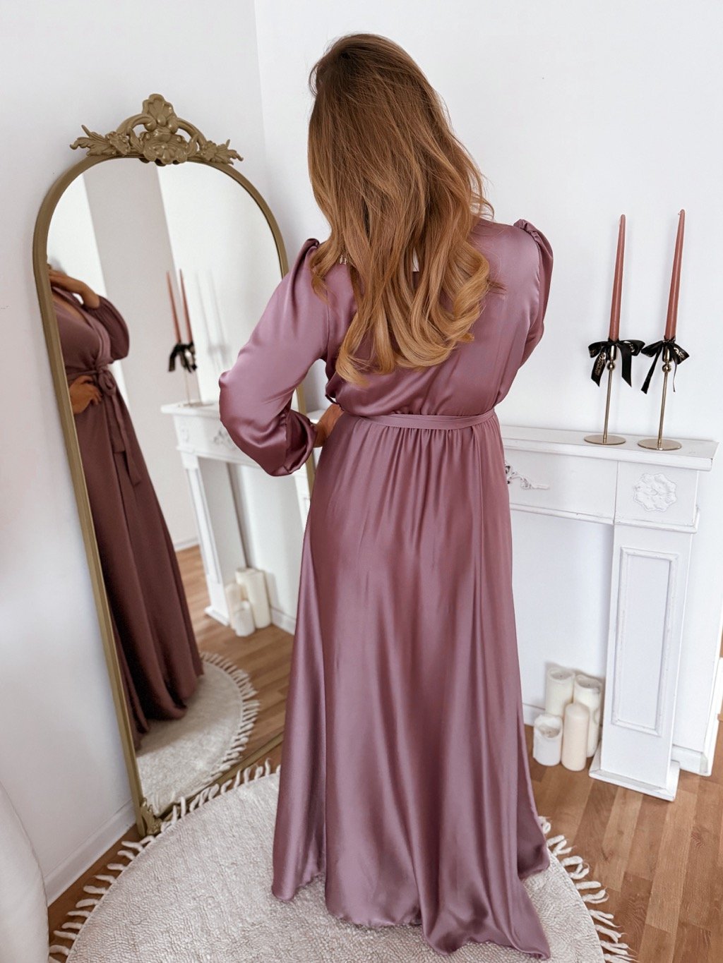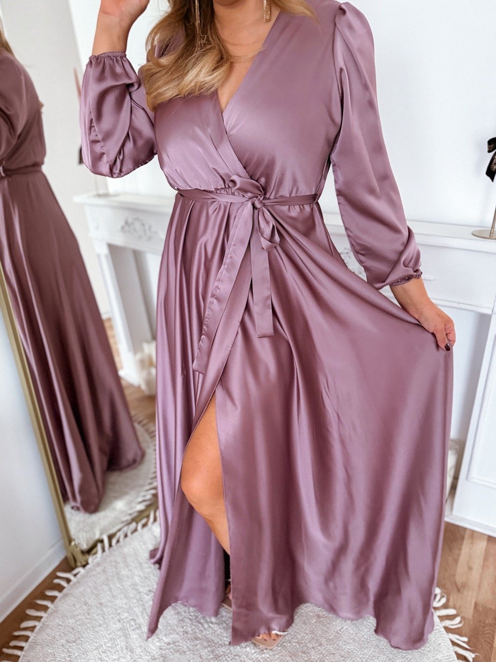 Dlhé saténové spoločenské šaty s elastickou gumičkou v páse a maxi sukňou sú ideálnou voľbou pre spoločenské udalosti, oslavy, svadby alebo iné špeciálne príležitosti. Modelka meria 168 cm a má na sebe veľkosť XL.