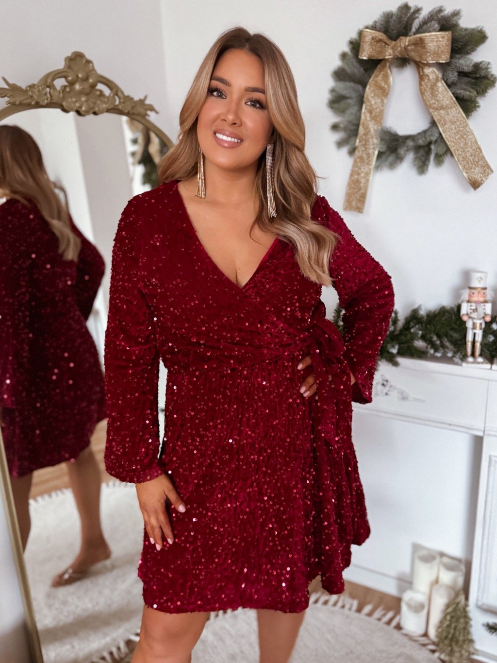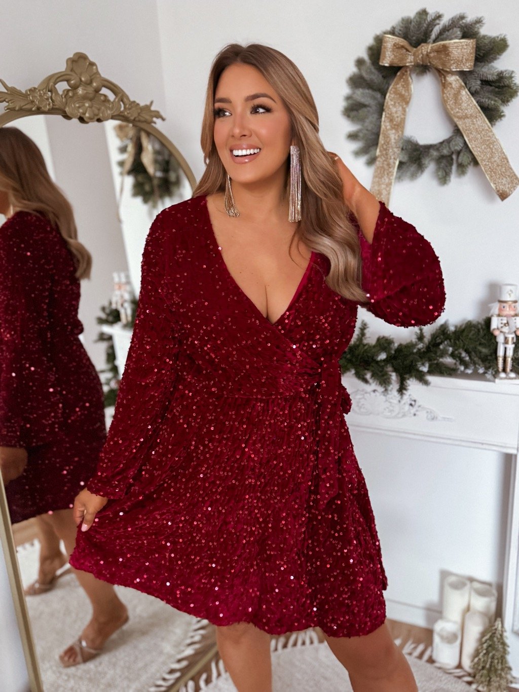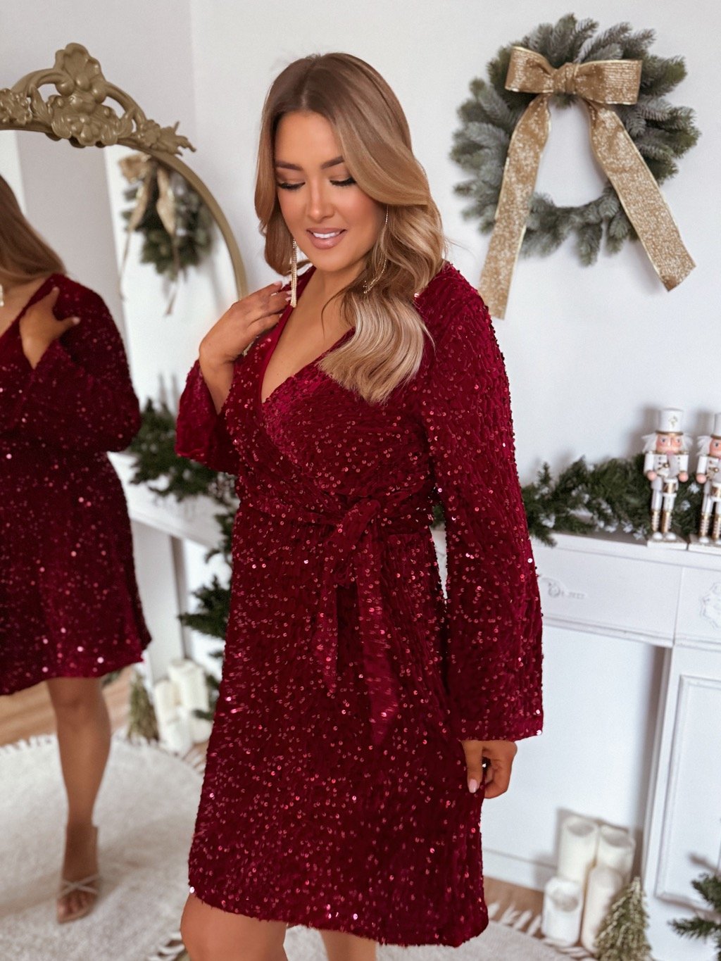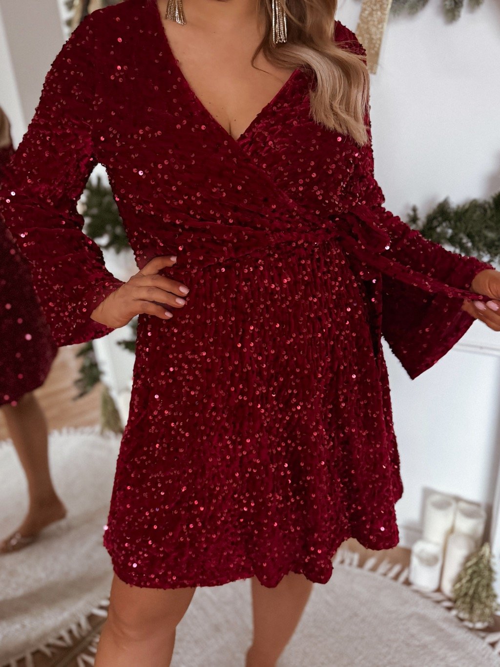 Flitrované krátke šaty s dlhým rukávom a viazaním v páse. Šaty majú elastickú gumičku v páse a výstrih do V. Modelka meria 168 cm a má na sebe veľkosť L/XL.