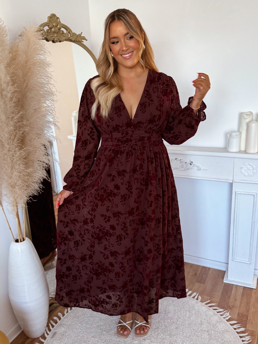 Dlhé bordové slávnostné šaty pre moletky s dlhým rukávom a výstrihom, šaty majú gumičku v páse ktorá krásne formuje siluetu. Modelka meria 168 cm a má na sebe veľkosť XL.