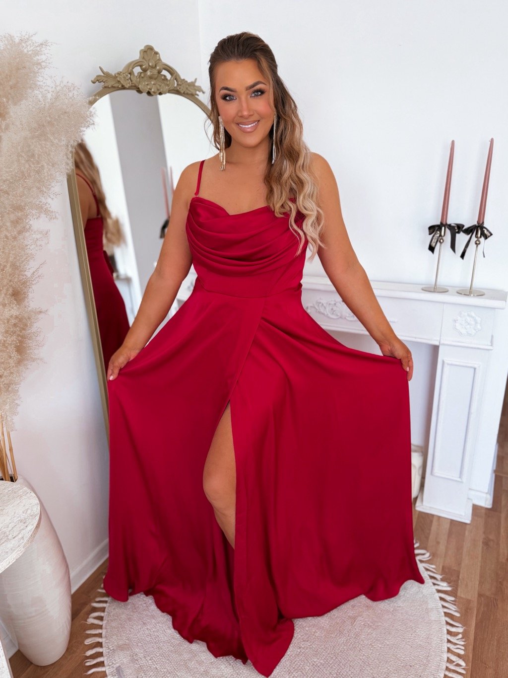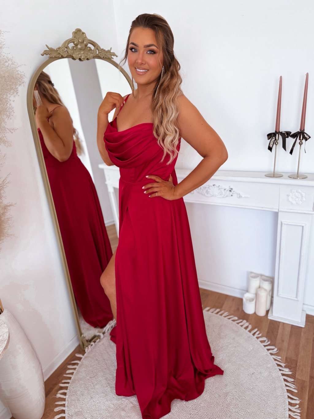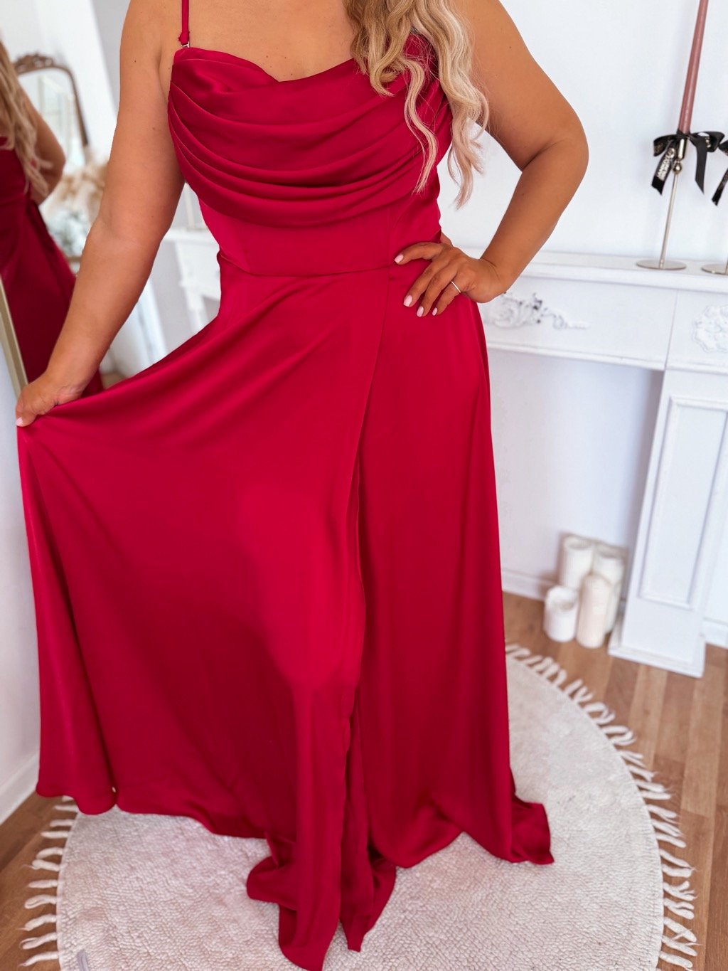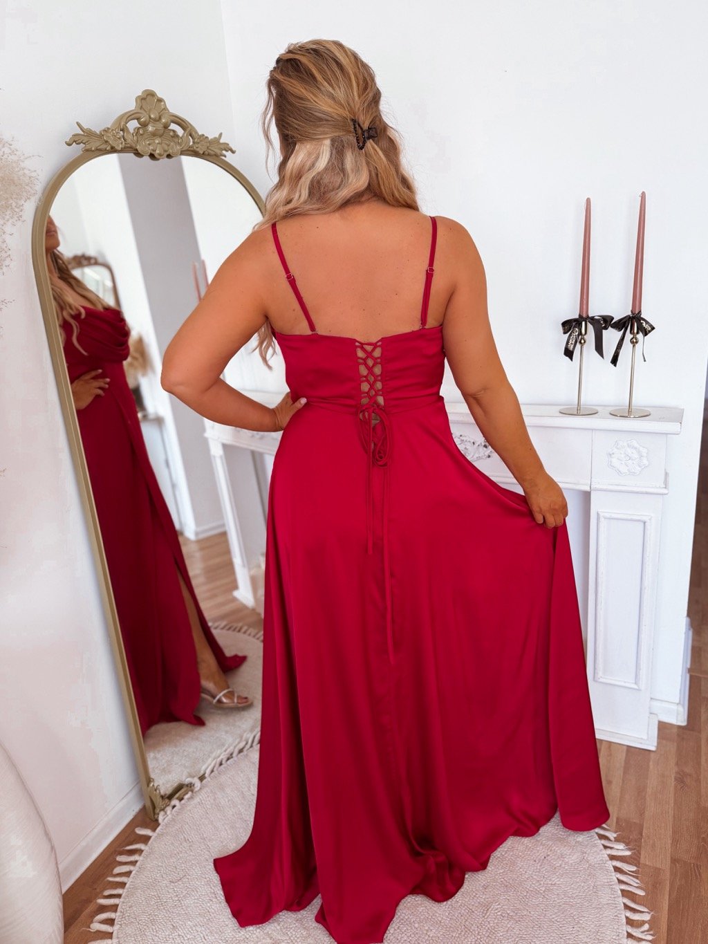 Spoločenské šaty s odnímateľnými ramienkami a šnúrovním na chrbte. Vďaka šnúorvaniu si šaty upravíte ako je potrebné. Modelka meria 168 cm a má na sebe veľkosť XL (42).