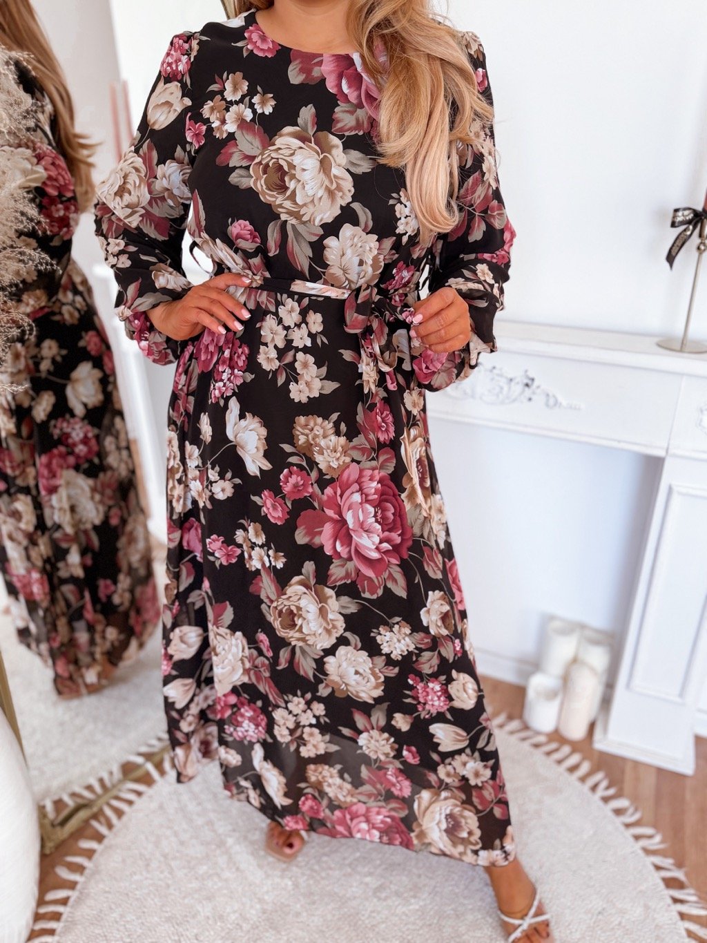 Spoločenské šaty s dlhým rukávom a voľnou sukňou. Šaty sa sťahujú opaskom v páse, od pása nadol sú tieto šaty úplne voľné. Modelka meria 168 cm a má na sebe veľkosť L/XL.