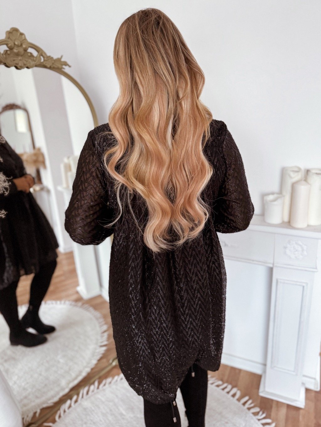 Čierne košeľové šaty s odleskom majú úlne voľný strih. Modelka meria 168 cm a má na sebe veľkosť L/XL.