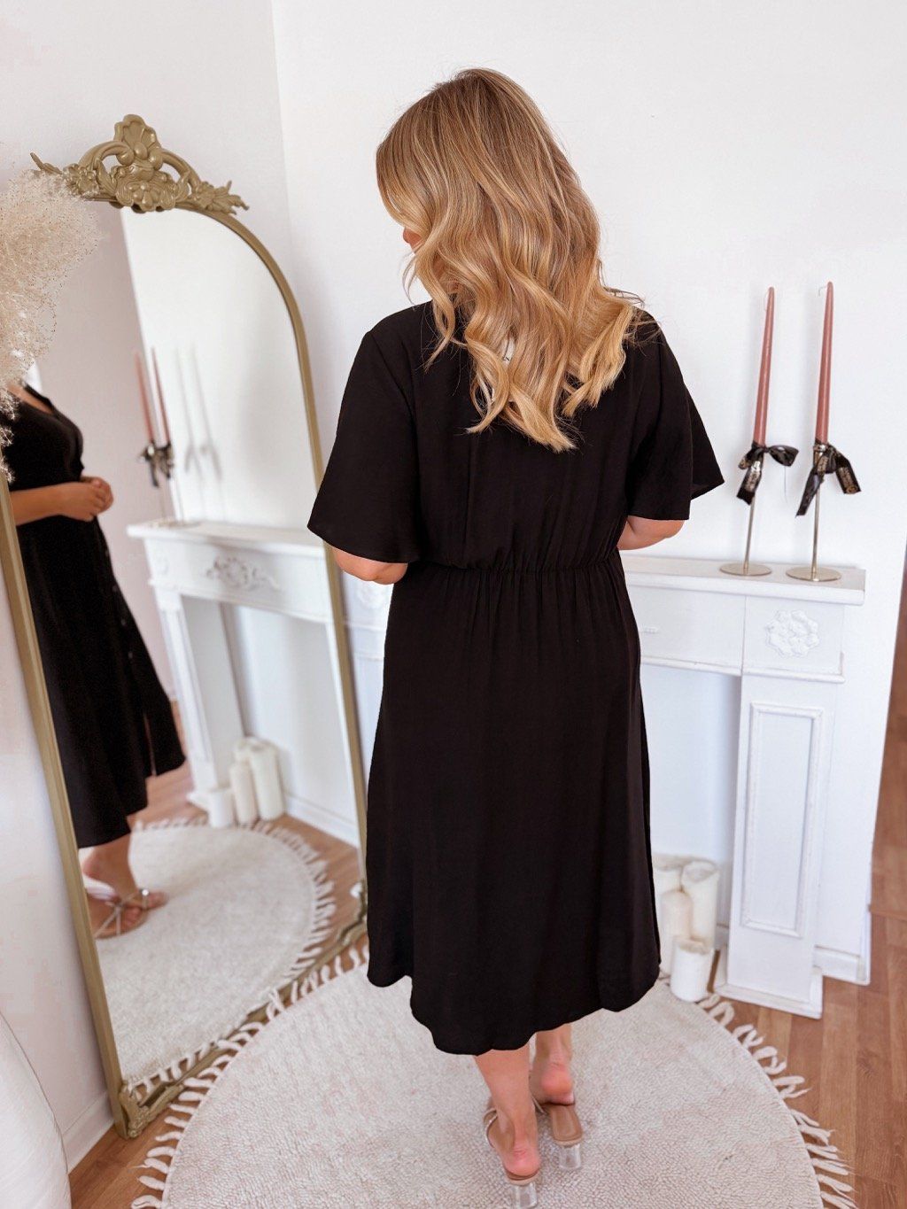Košeľové šaty majú v páse jemnú gumičku, ktorá sa prispôsobí postave a zvýrazní siluetu. Bočné zaväzovanie na mašľu umožňuje šaty individuálne stiahnuť podľa potreby, vďaka čomu krásne sedia a pôsobia žensky a lichotivo. Modelka meria 168 cm a má na sebe veľkosť XL.