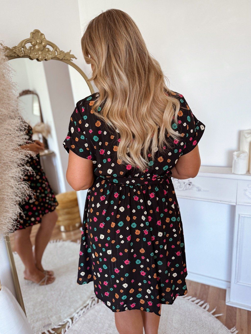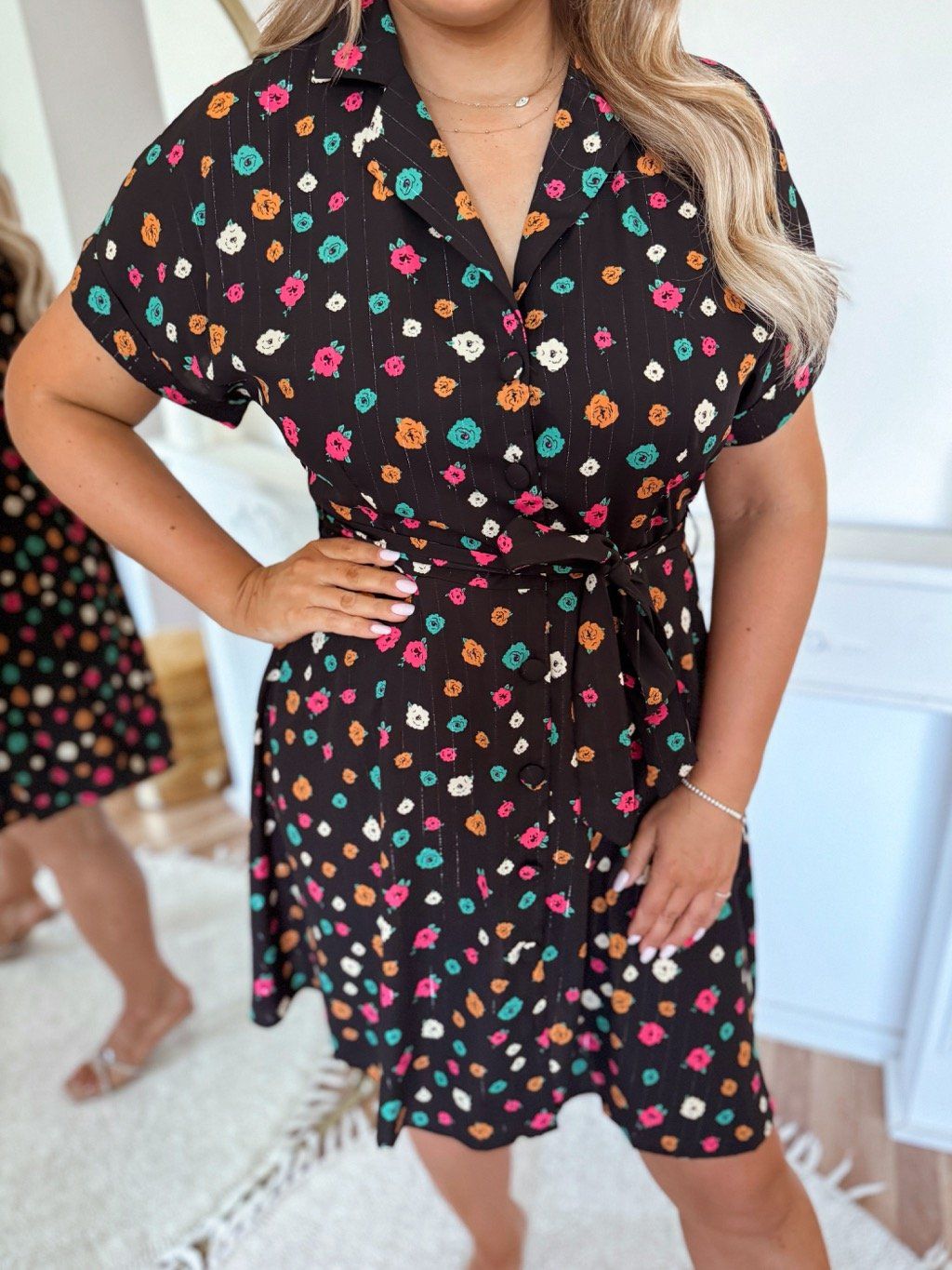 Krátke áčkové košeľové šaty s golierom a sukňou ktorá je úplne voľná. Modelka meria 168 cm a má na sebe veľkosť XL.