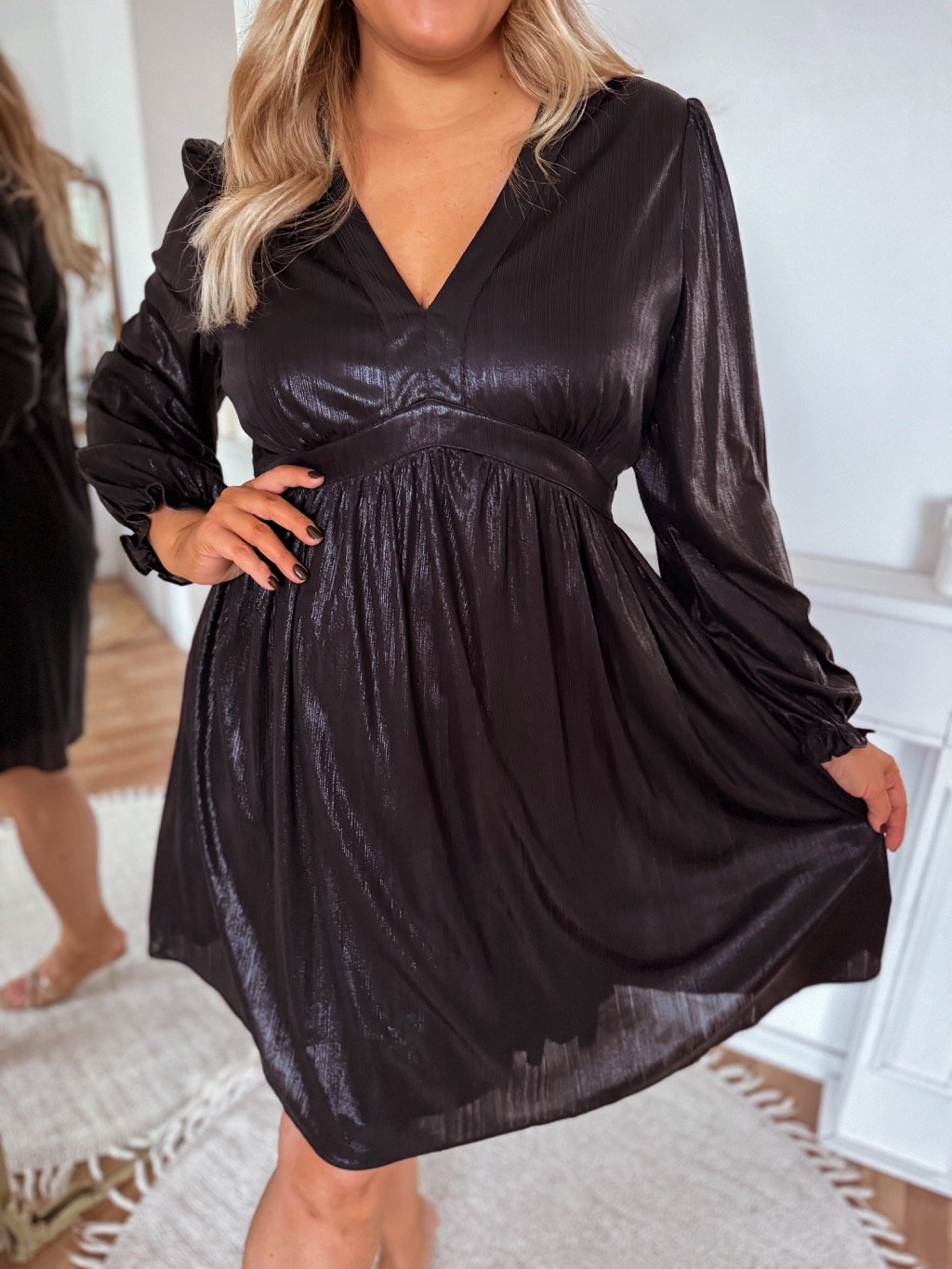 Krátke čierne lesklé šaty s dlhým rukávom a voľnou sukňou. Modelka meria 168 cm a má na sebe veľkosť XL.