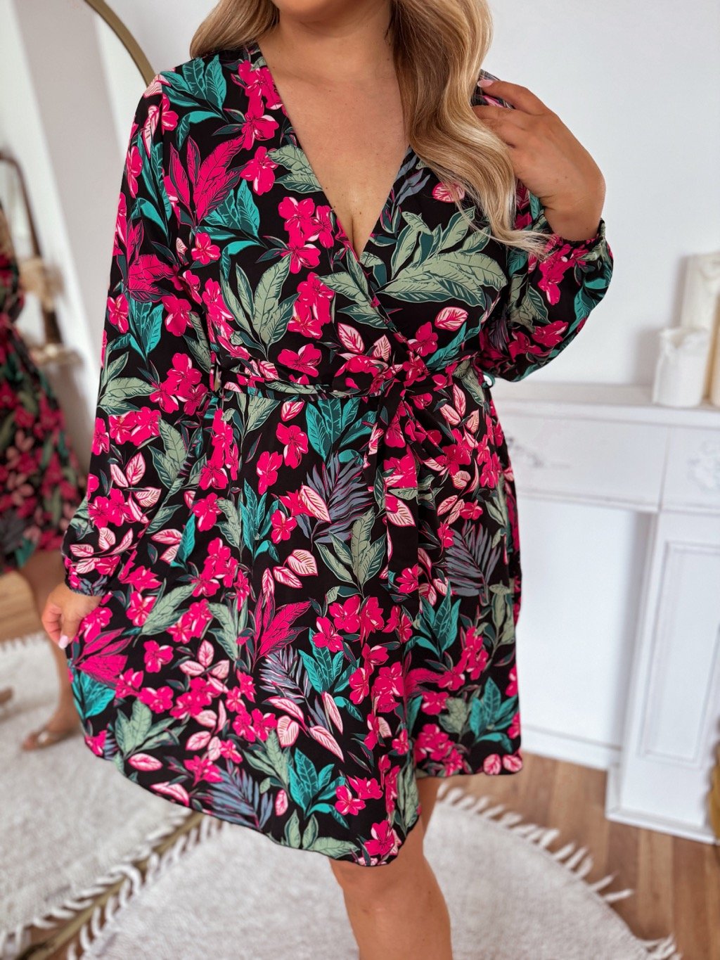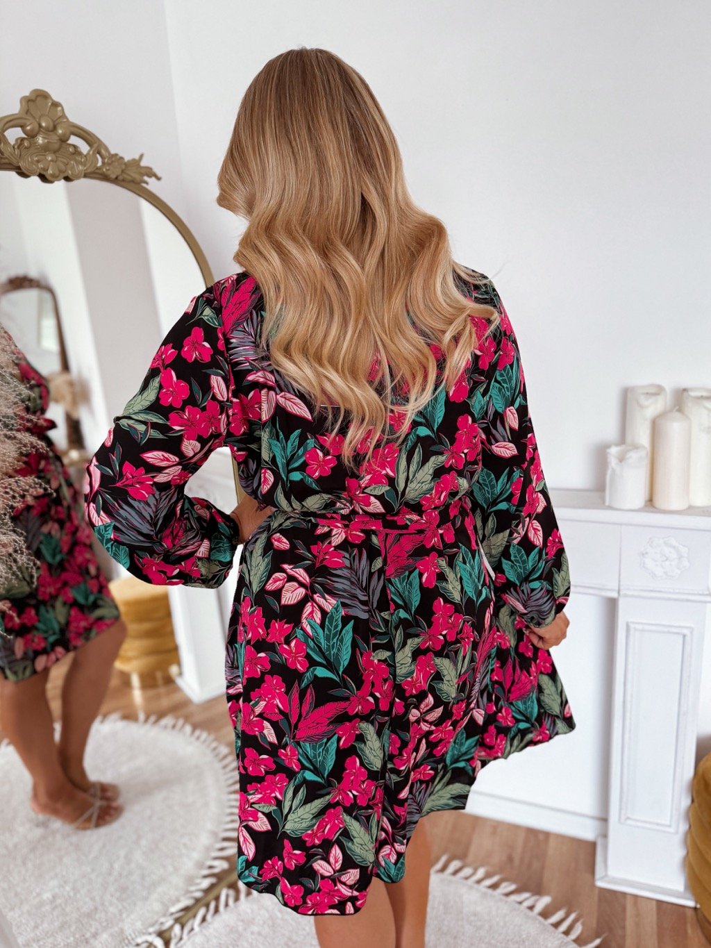 Krátke dámske šaty s gumičkou v páse a výstrihom do V. Modelka meria 168 cm a má na sebe veľkosť L/XL.