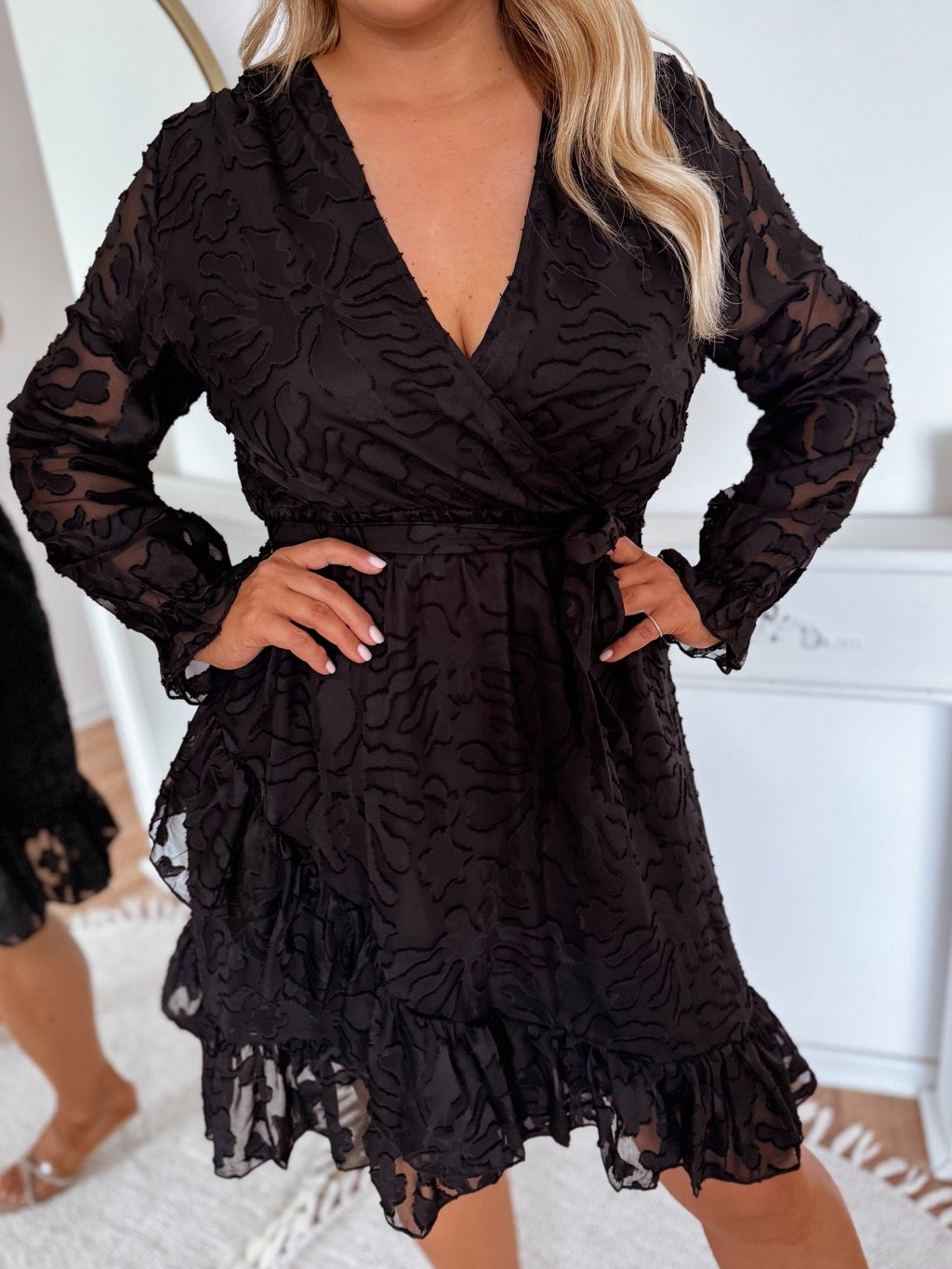 Krátke čierne šaty majú gumičku v páse. Rukávy sú priehľadné. Modelka meria 168 cm a má na sebe veľkosť L/XL.