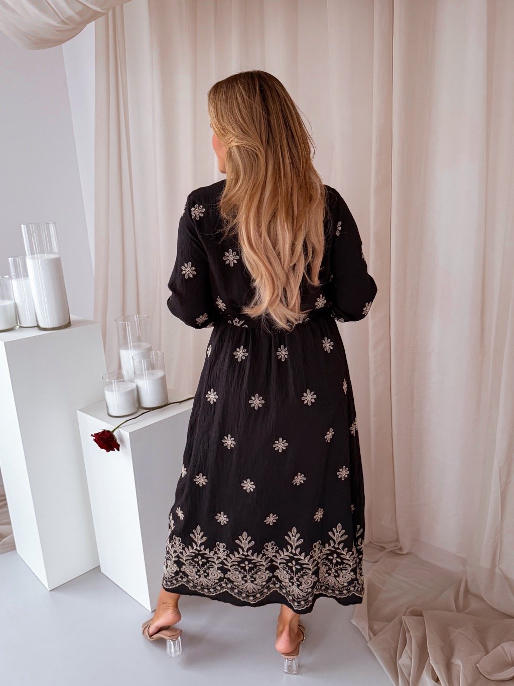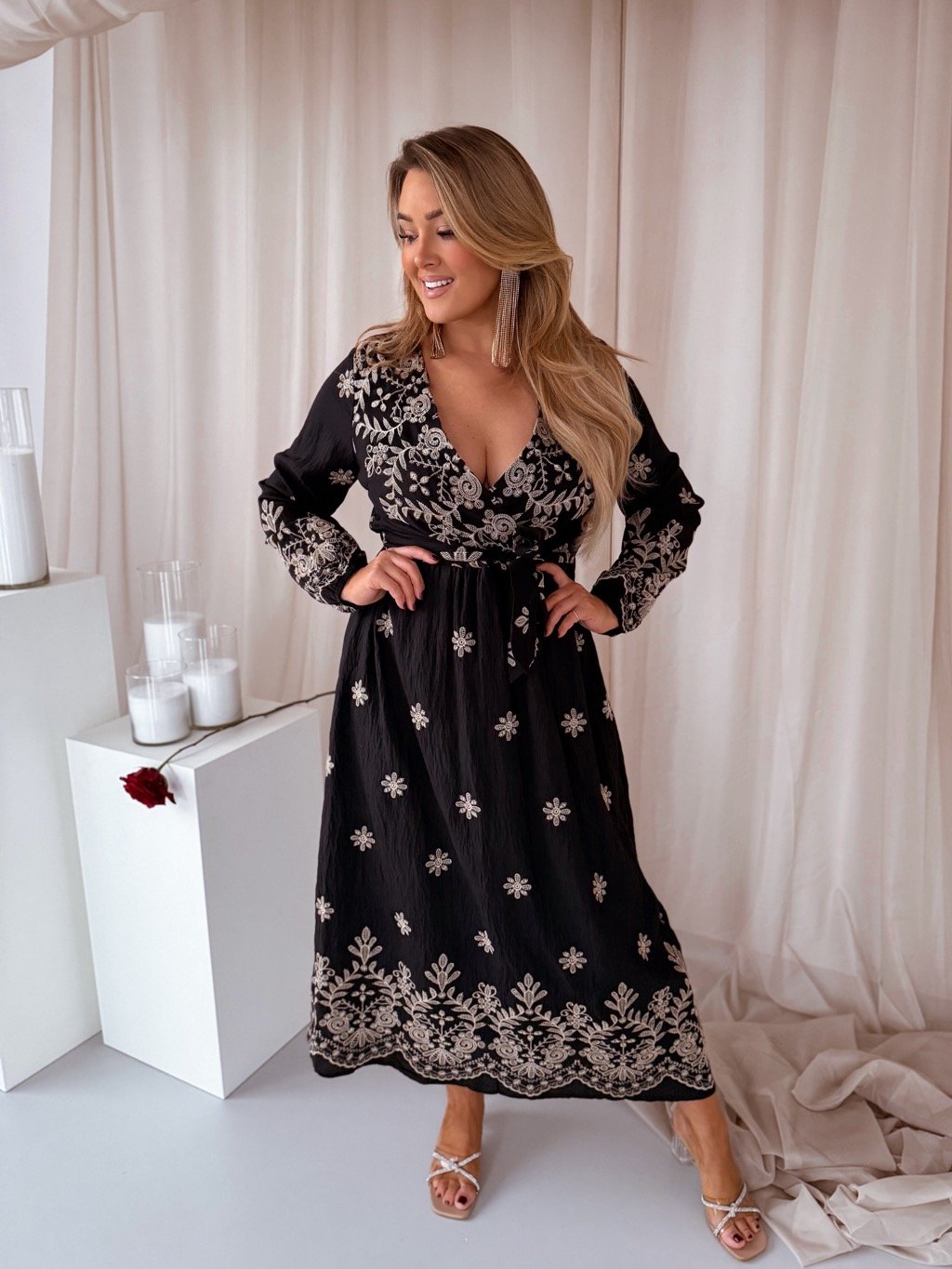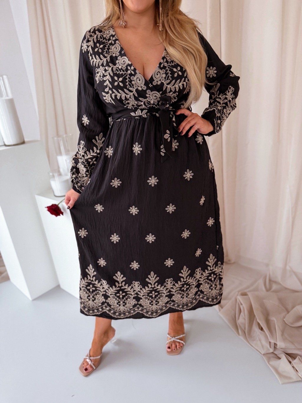 Dlhé elegantné bavlneno-ľanové dámske šaty majú vyšívaný vzor na látke. Majú gumičku v páse. Od pása nadol sú šaty voľné. Modelka meria 168 cm a má na sebe veľkosť XL/XXL.