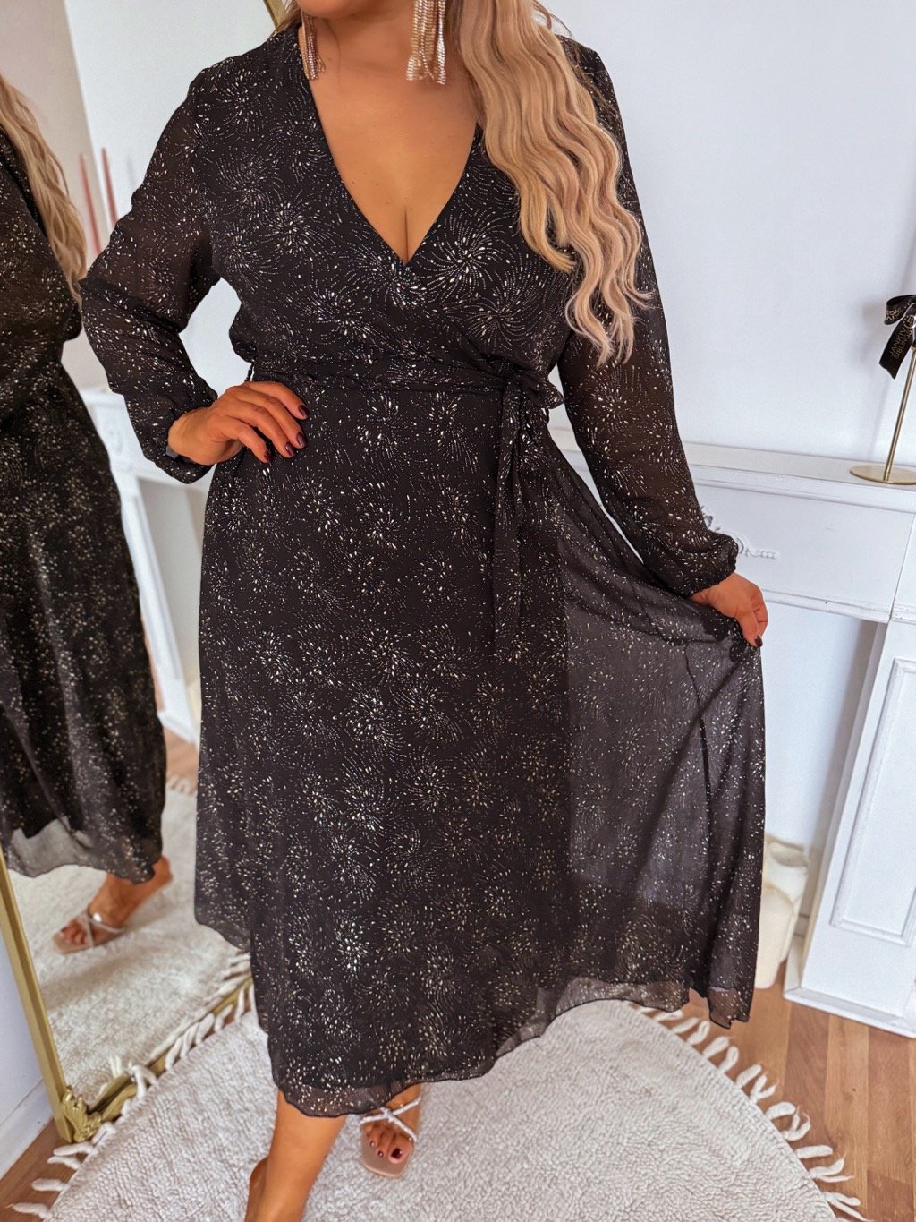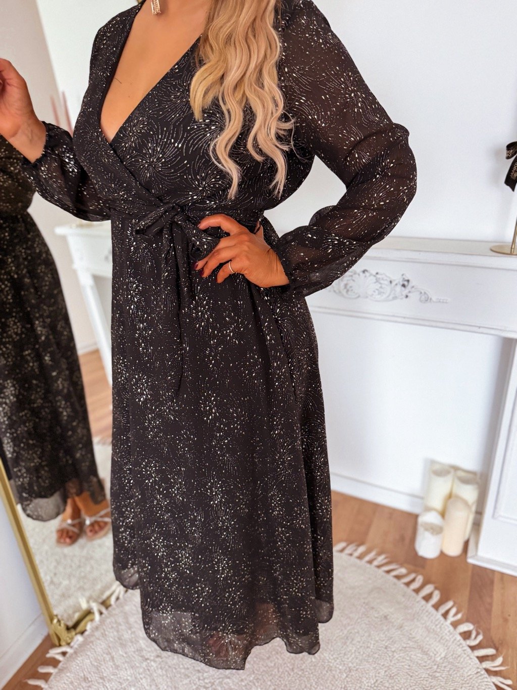 Dlhé elegantné dámske šaty majú zlatý vzor na látke. Majú gumičku v páse. Od pása nadol sú šaty voľné. Modelka meria 168 cm a má na sebe veľkosť XL/XXL.