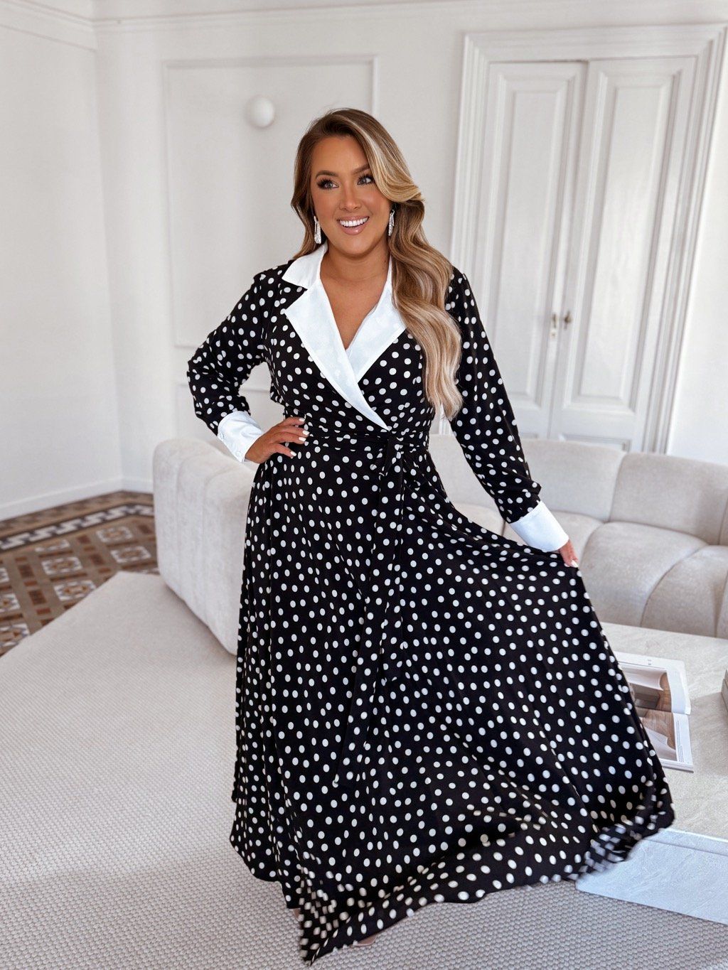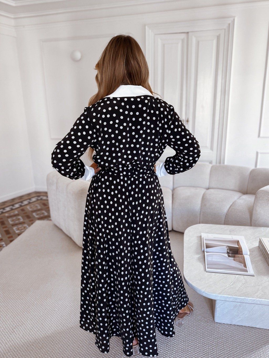Čierno-biele bodkované šaty s golierom