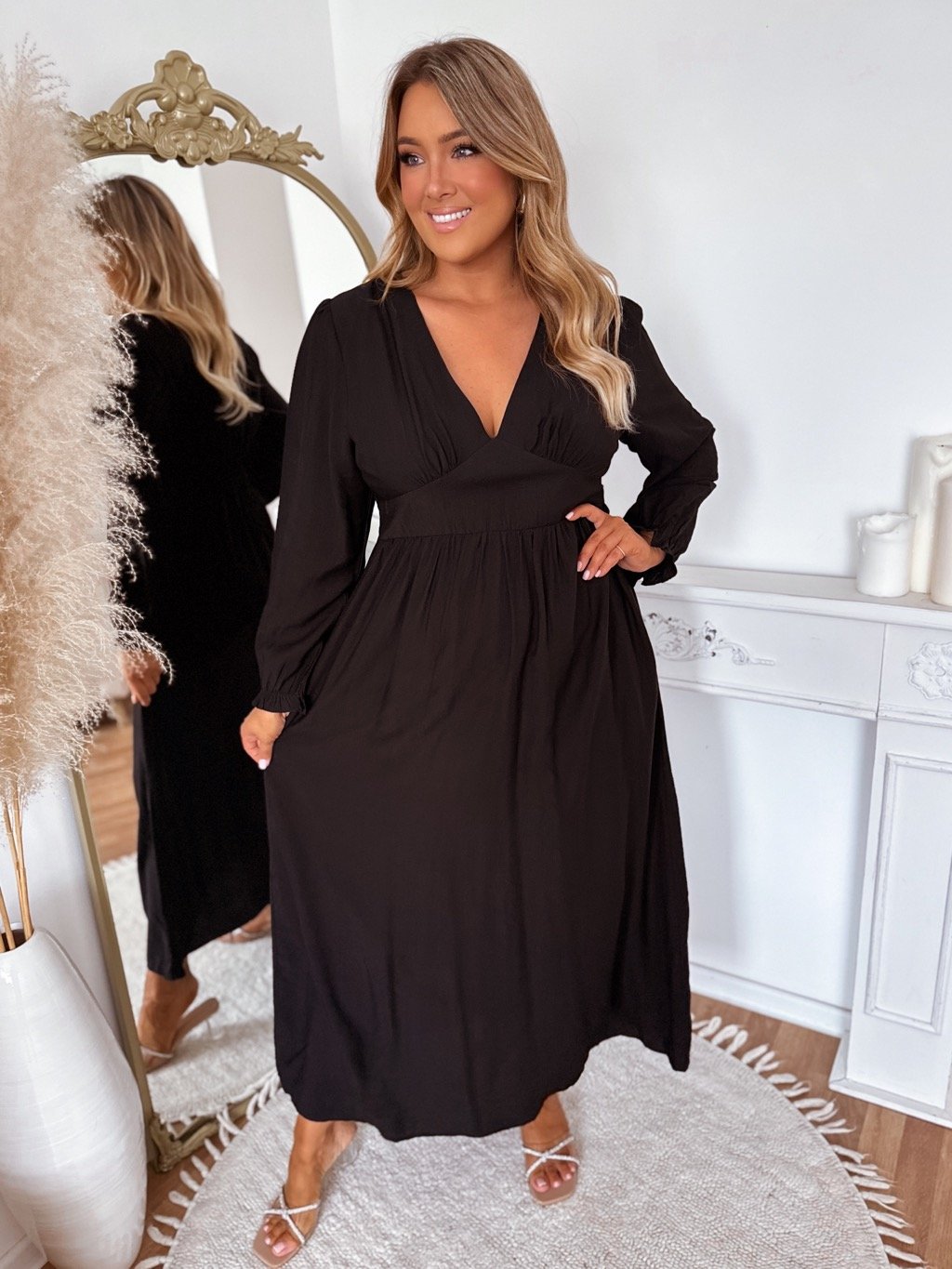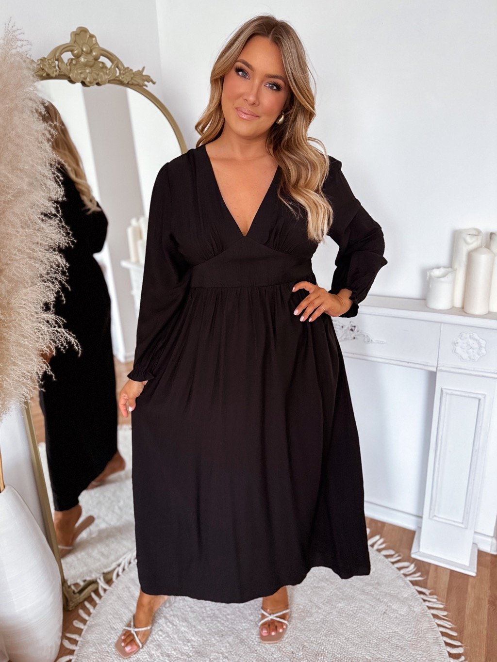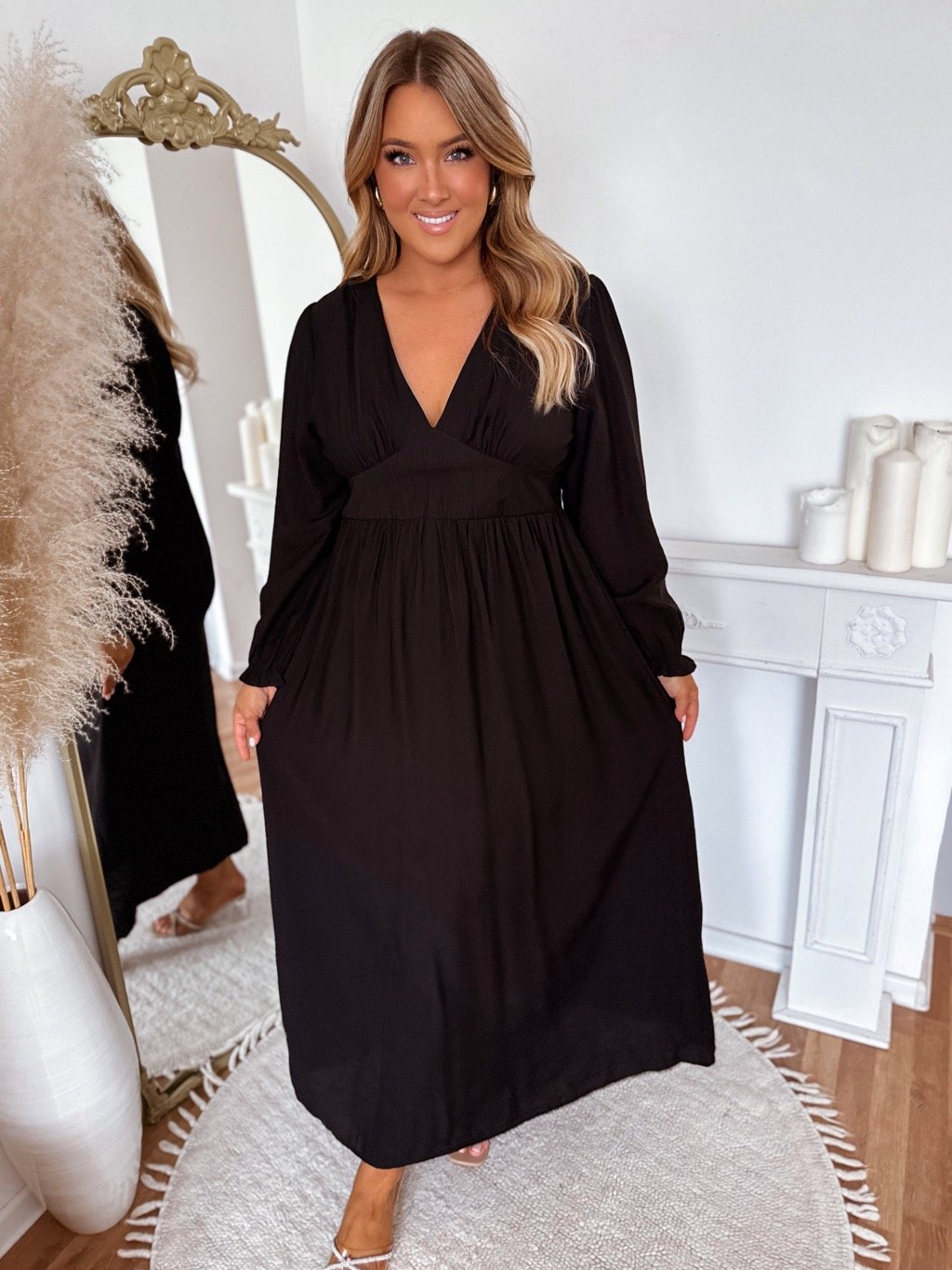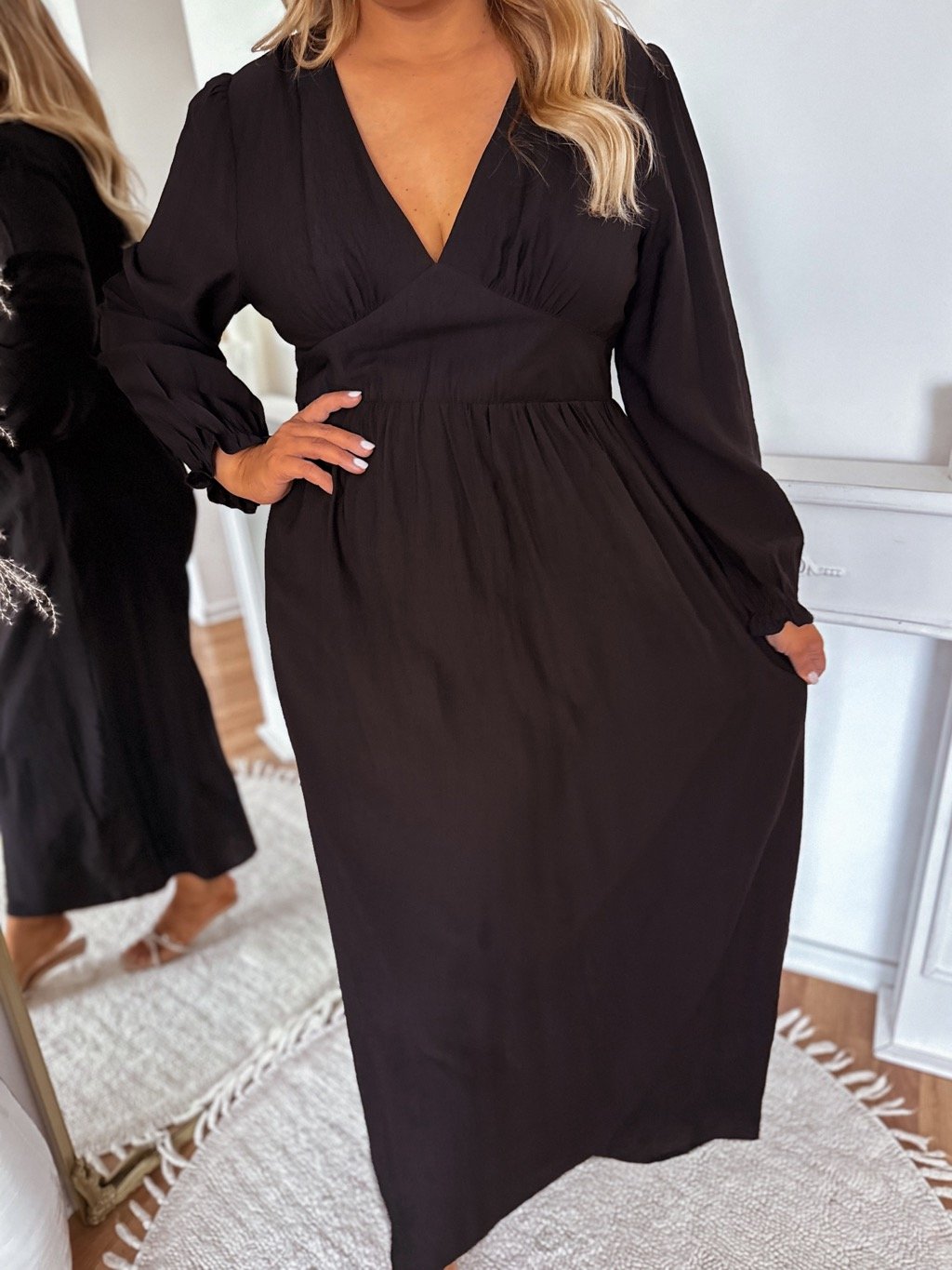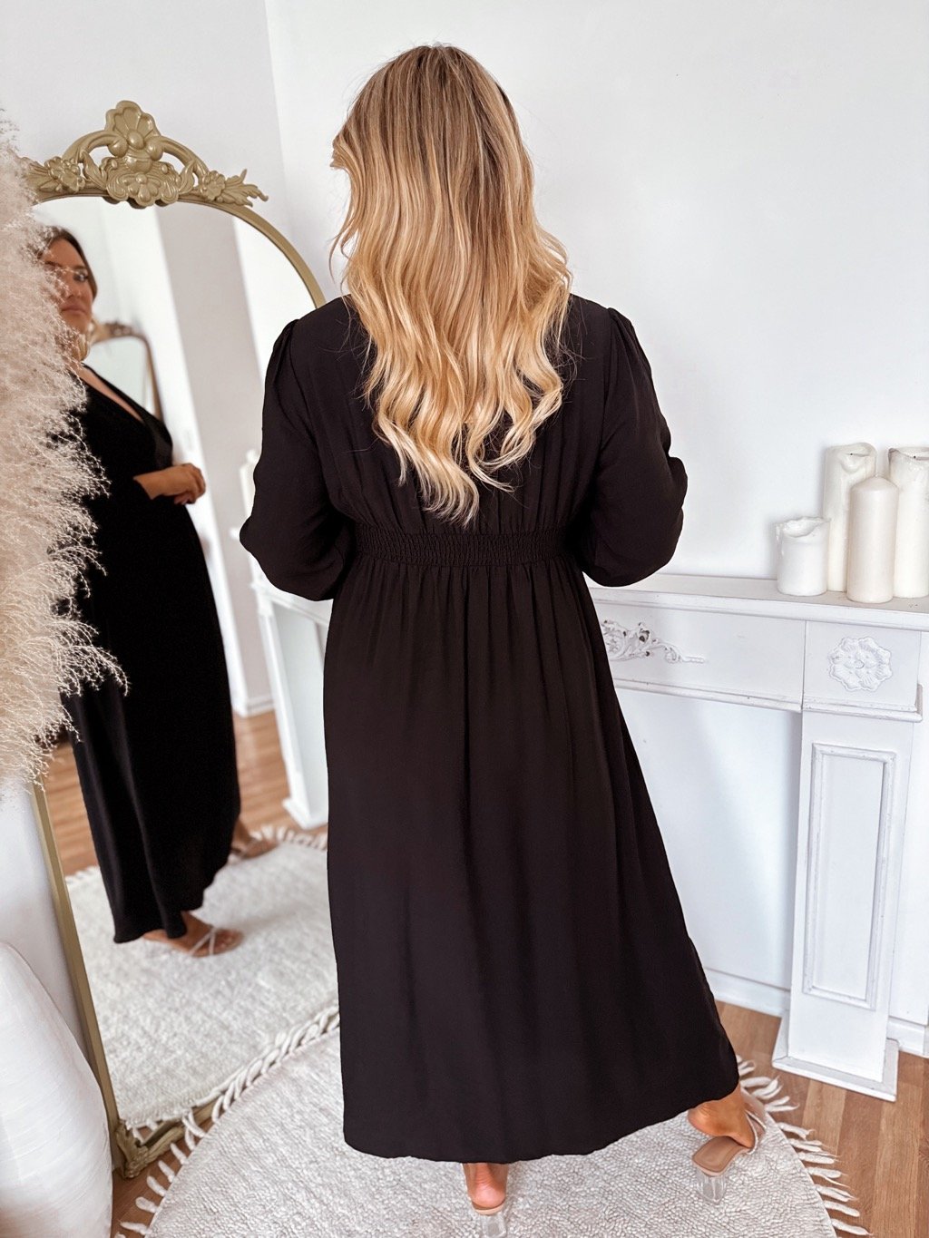 Elegantné dámske maxi šaty v čiernej farbe, ktoré zaujmú svojou jednoduchosťou a nadčasovým dizajnom. Šaty majú hlbší výstrih do V, dlhé rukávy a zvýraznený pás, ktorý opticky tvaruje postavu. Na chrbte je našitá elastická gumička. Vďaka ľahkému materiálu a voľnejšiemu strihu sú pohodlné na nosenie počas celého dňa. Ideálne na spoločenské udalosti, oslavy, večerné príležitosti, ale aj na elegantné každodenné outfity. Modelka meria 168 cm a má na sebe veľkosť XL.