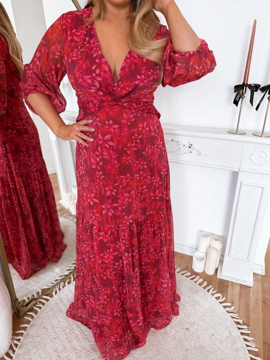 Dlhé elegantné šaty s hlbokým výstrihom sú zúžené v páse, majú zapínanie na zips na chrbte a jemné penové vypchávky na prsiach. Tieto šaty nie sú elastické. Modelka meria 168 cm a má na sebe veľkosť XL.
