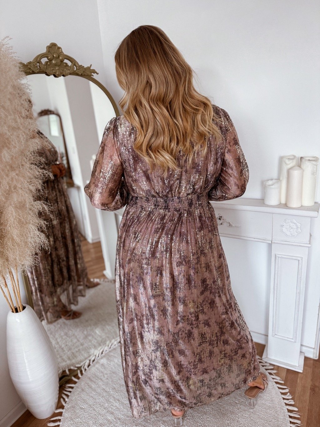 Elegantné maxi šaty v odtieňoch champagne s jemným leskom pôsobia luxusne a žensky. Výstrih do tvaru V krásne zvýrazní dekolt, zatiaľ čo zvýraznený elastický pás opticky tvaruje postavu. Ideálne na spoločenské udalosti, svadby, oslavy či večerné príležitosti, kde zaručene zaujmete svojím štýlom.Modelka meria 168 cm a má na sebe veľkosť XL.